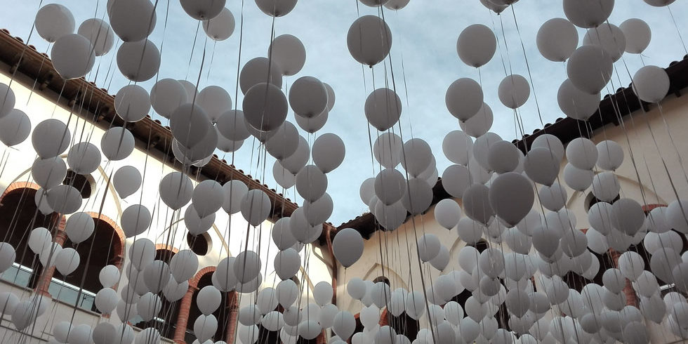 With the proposal “Plou i fa sol”, the aim is to get the viewer to interact with the weather. The courtyard of Sant Jordi and Sant Domènec is filled with balloons inflated with helium each one tied with a thread that almost reaches the ground. They form a cloud that can be modified by visitors. With this installation and the participation of the visitors, the aim is to make the space change over time and to change the “weather”. Move the balloons and make the sun rise!