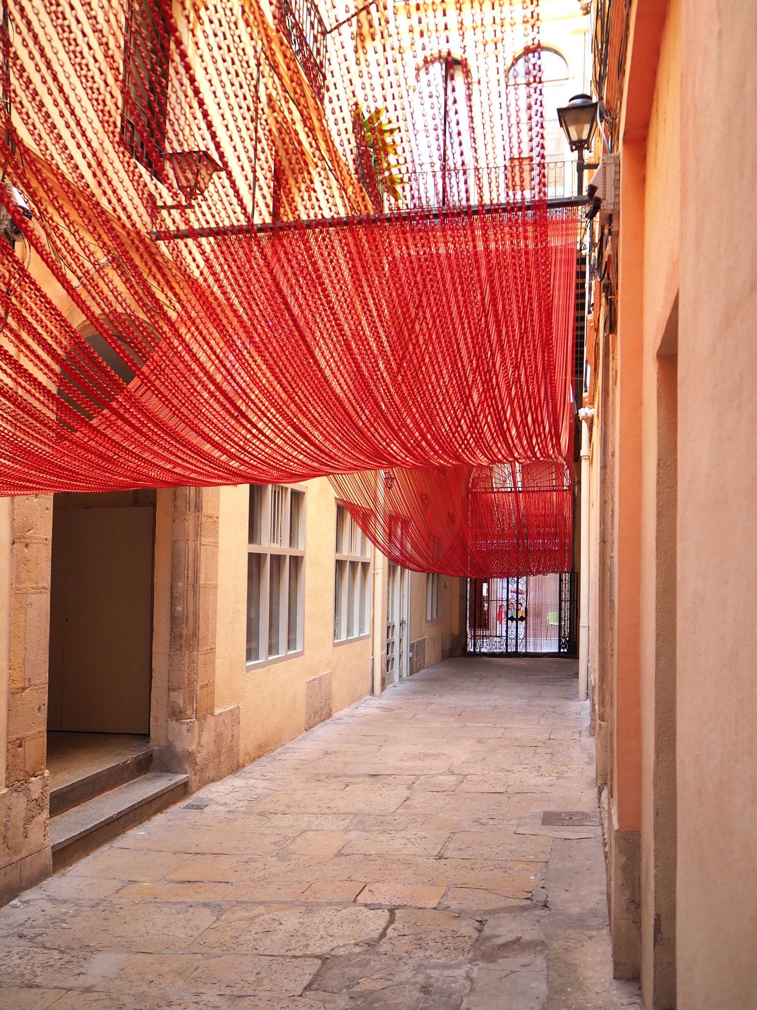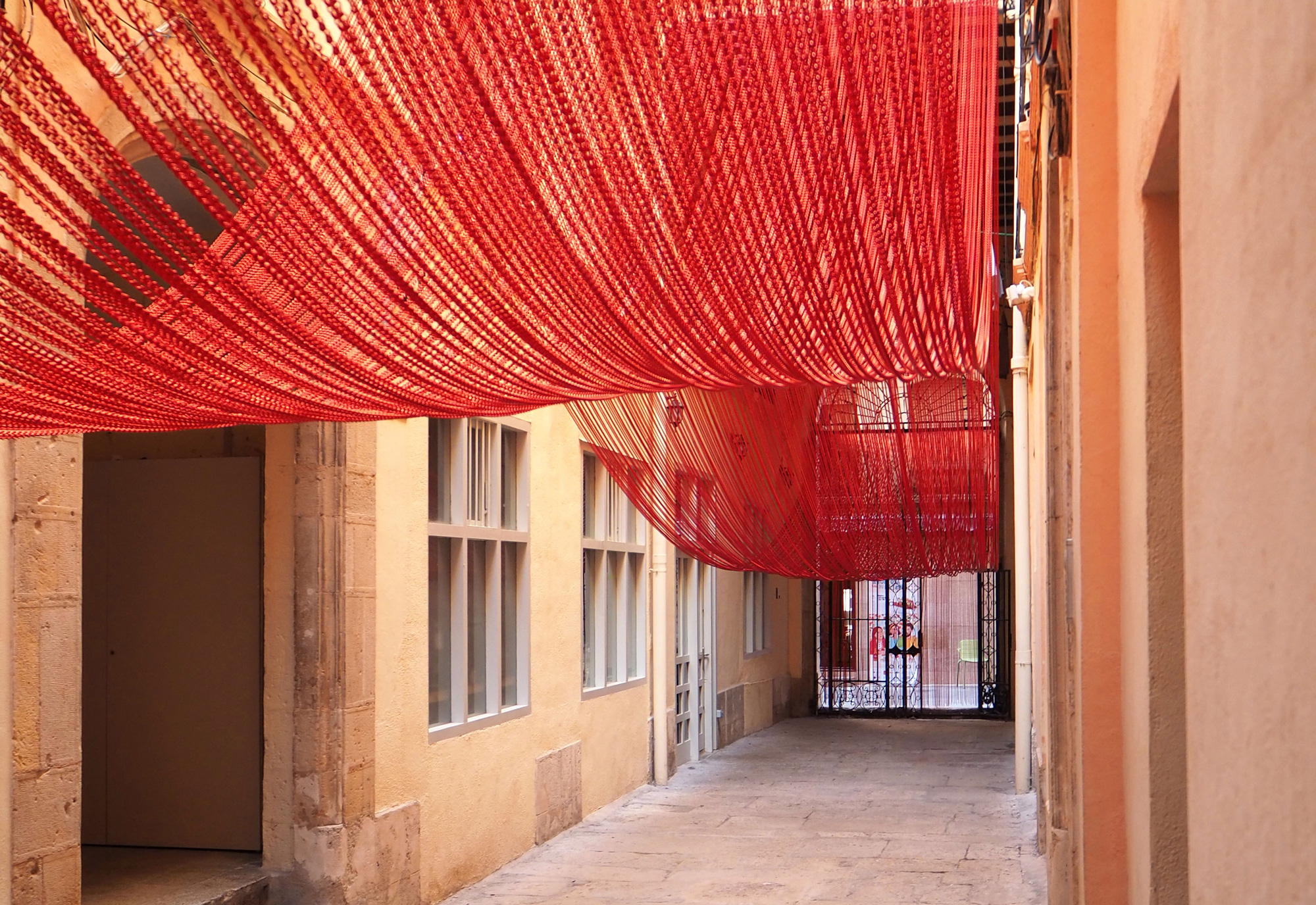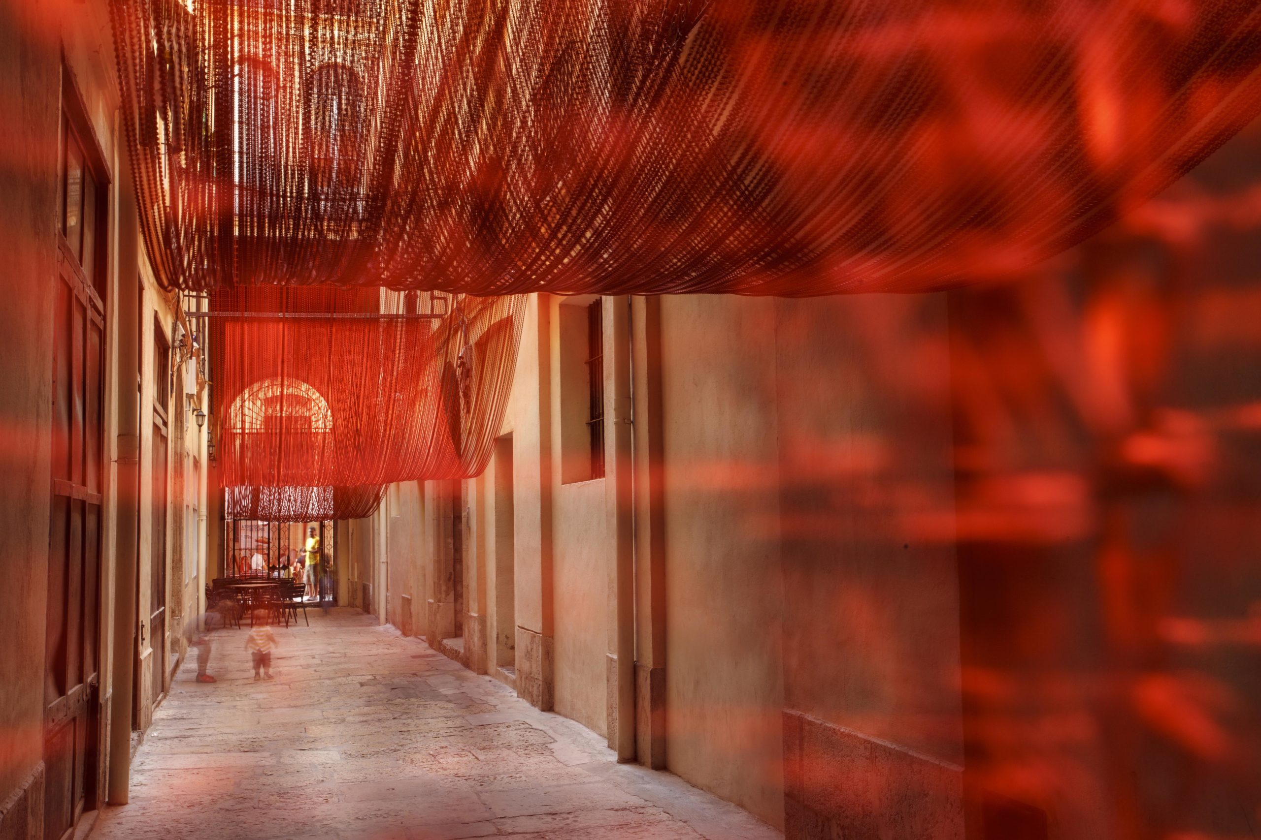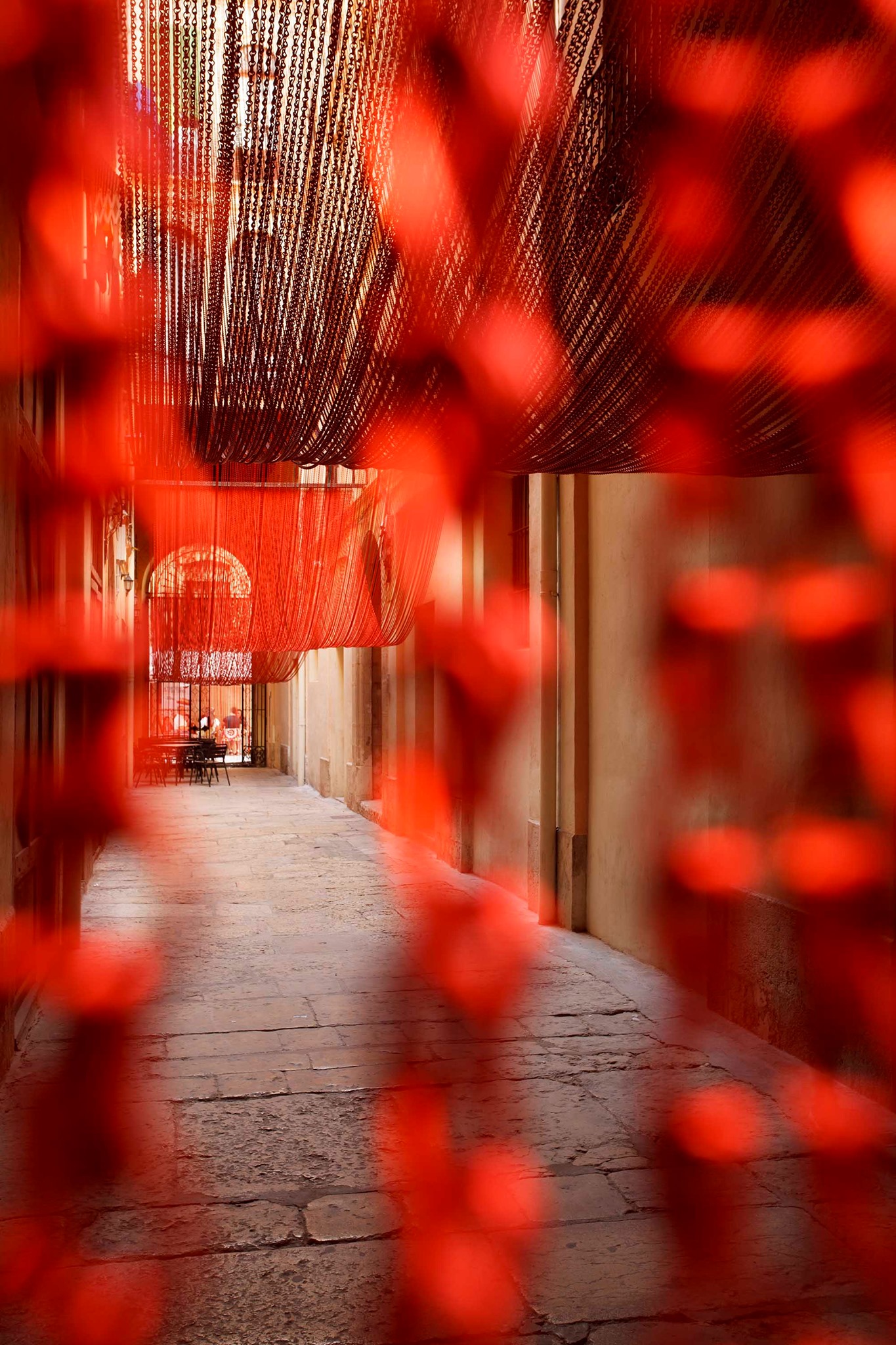 As if it were an Oriental silk robe, this work is made up of a dossal (baldaquí) composed of anodised aluminium chains of a suggestive red colour, with bright reflections when seen against the light. Even though this fabric is thick enough to block your sight, filter the rays of the sun and create an internal space, the typology of these chains allows for prying and curious eyes.