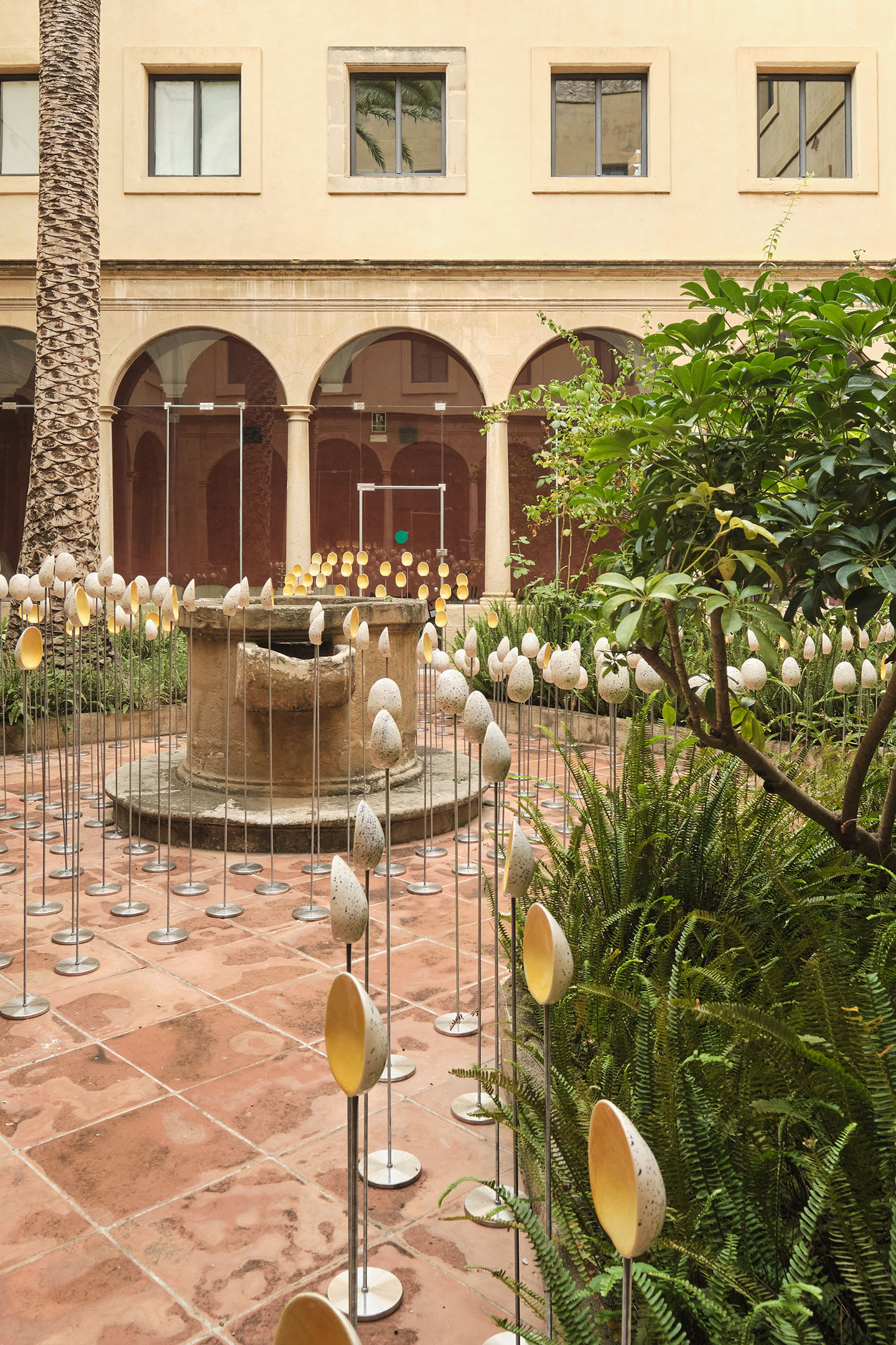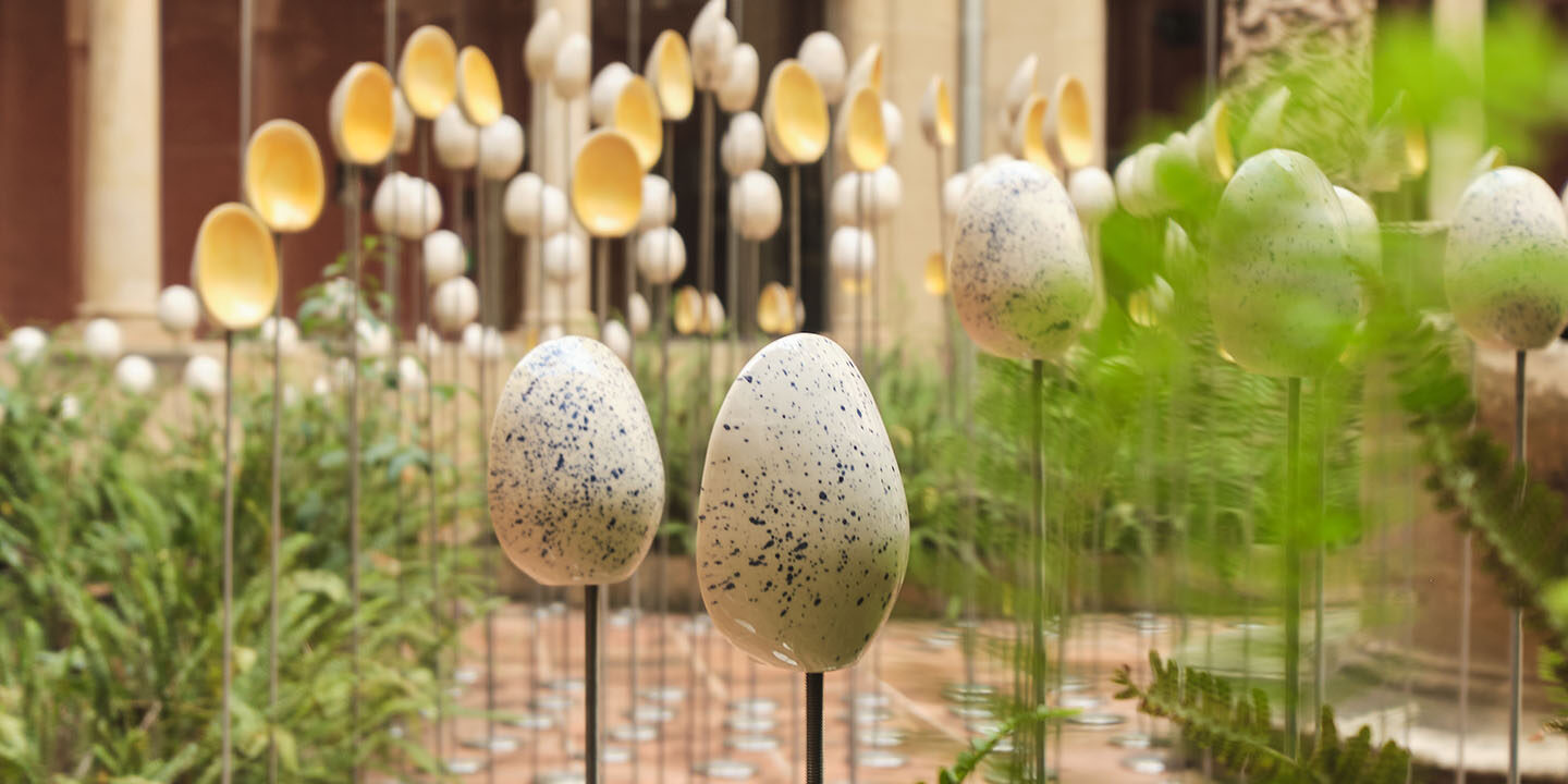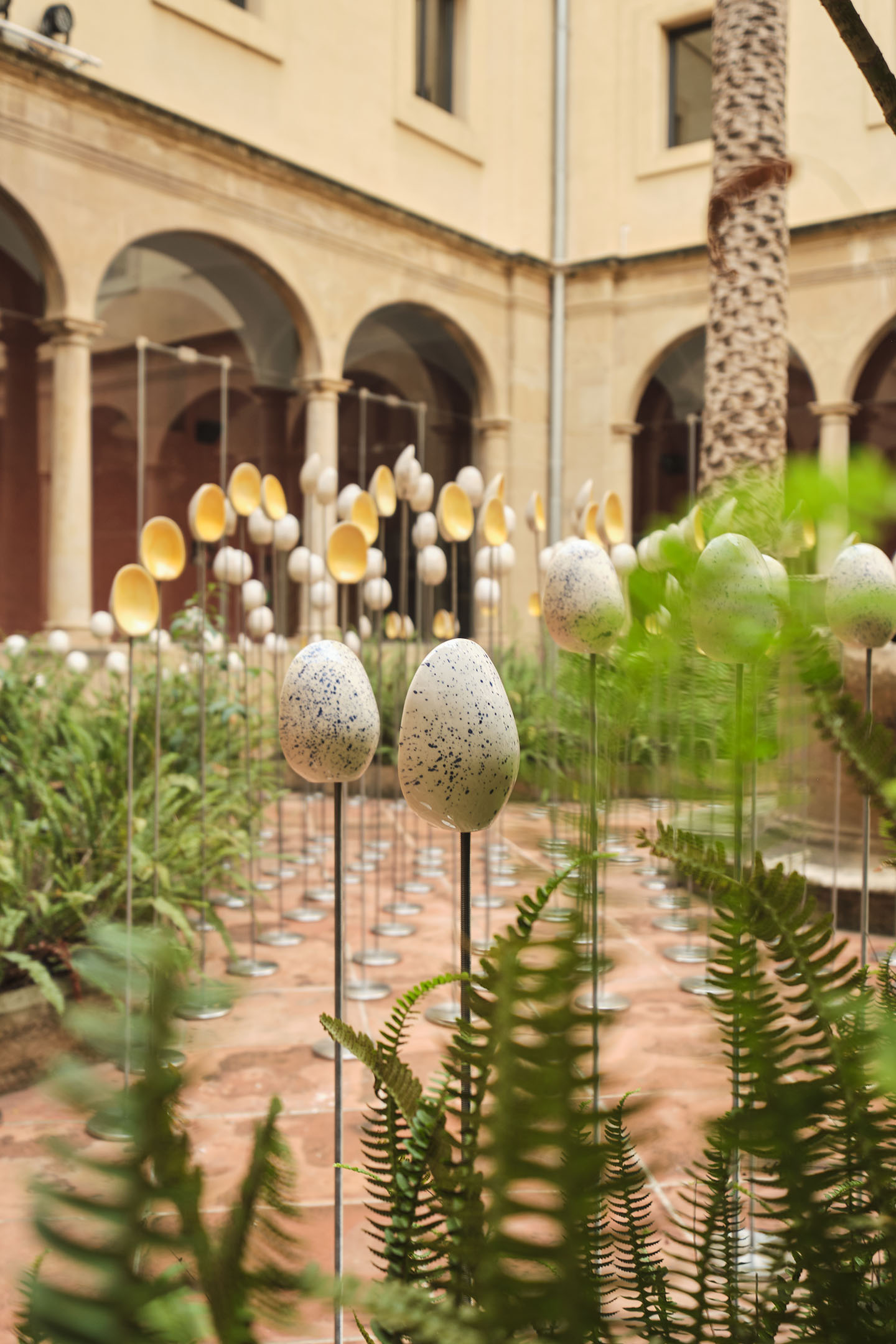 Innovation and craftsmanship go hand in hand in this installation that was created using parametric design and digital modeling techniques, then built by hand in the Seville workshop of the artist Raquel Eidem, through a delicate process using traditional techniques from the ancient Andalusian art of ceramics. The firing and enameling give the pieces their own identity that encourages you to observe them closely and appreciate the importance of art and craftsmanship.