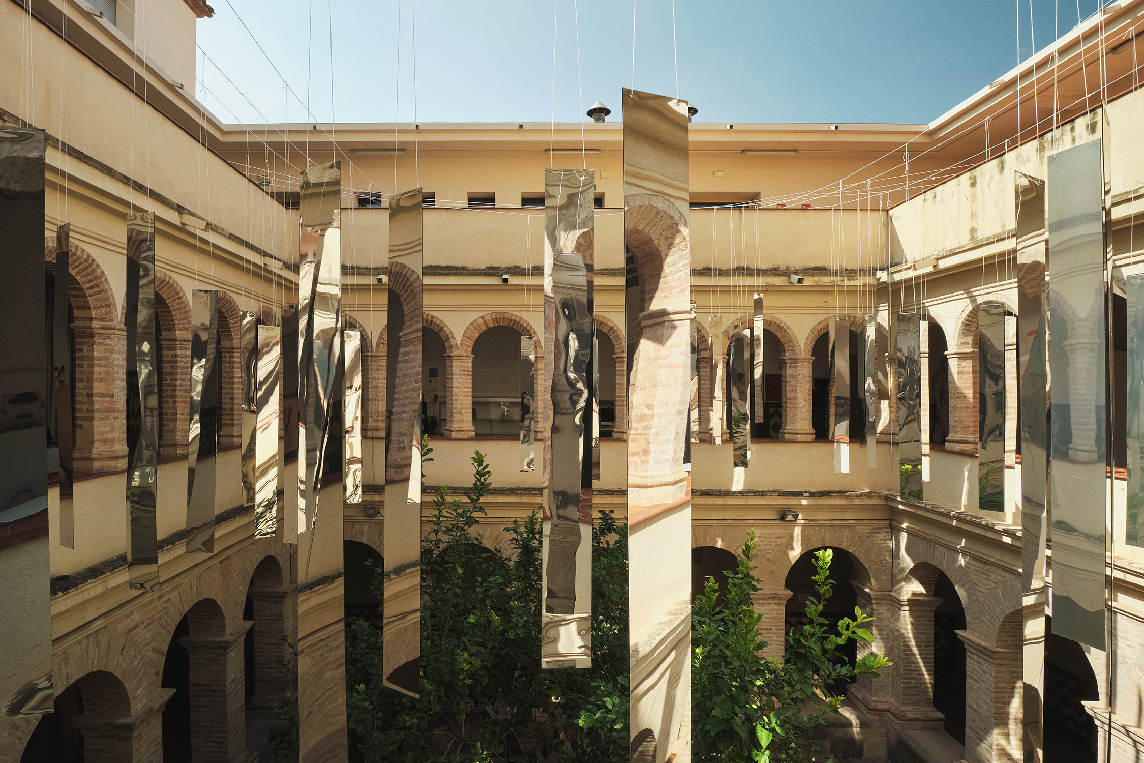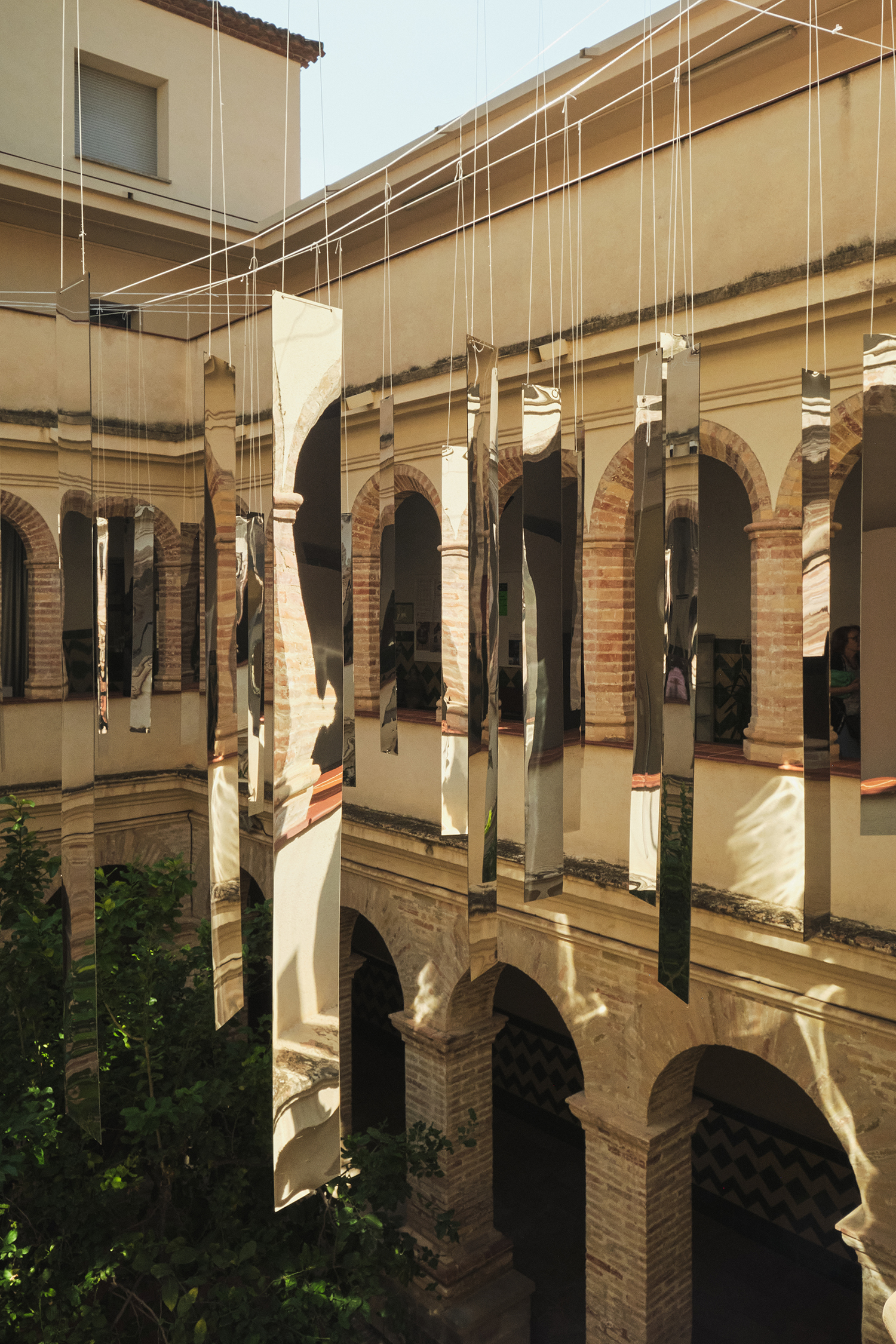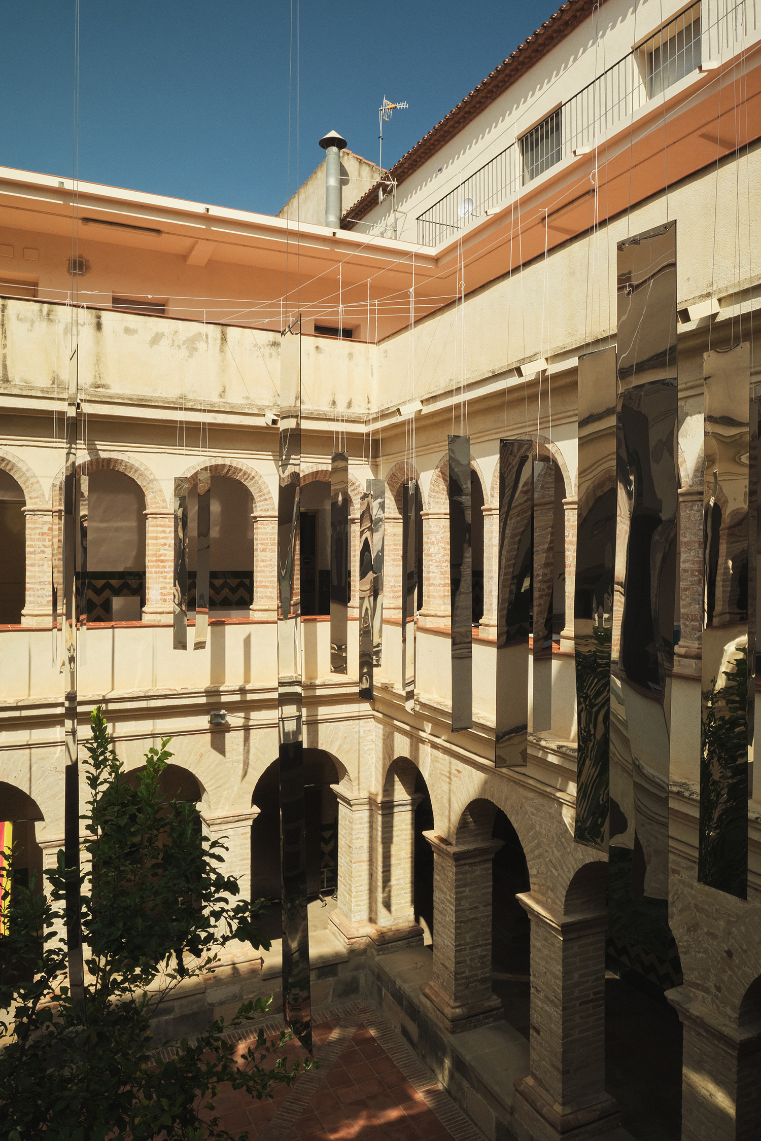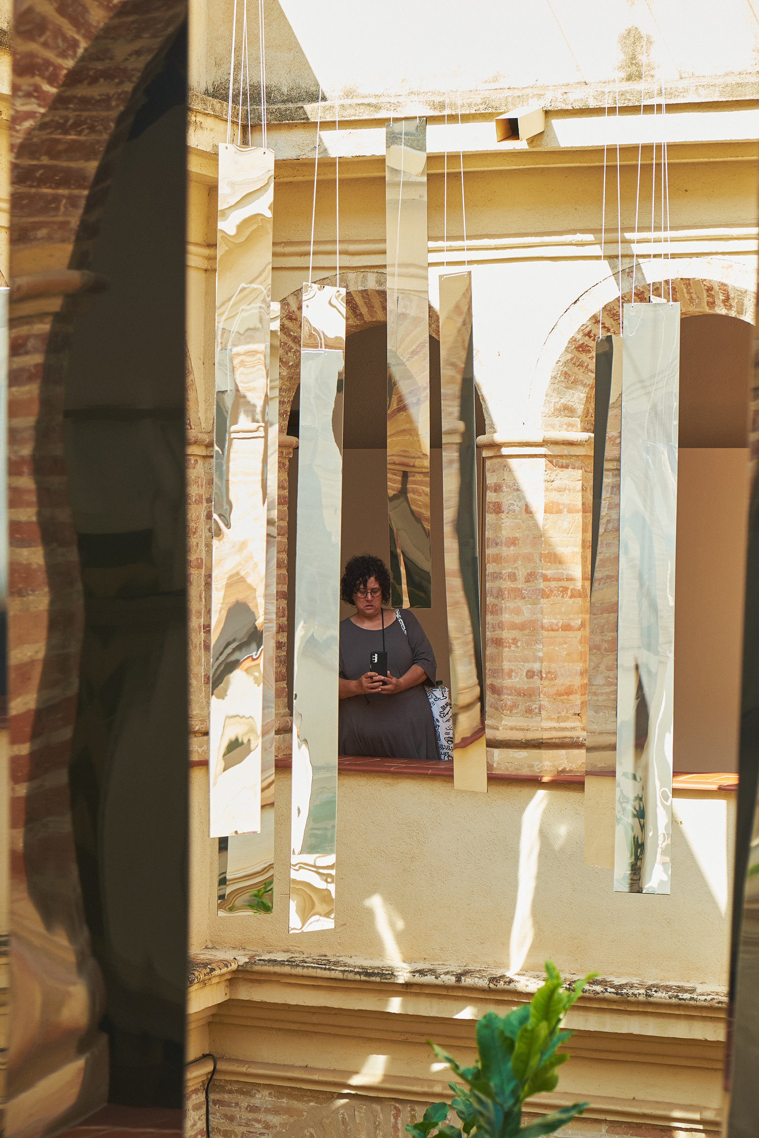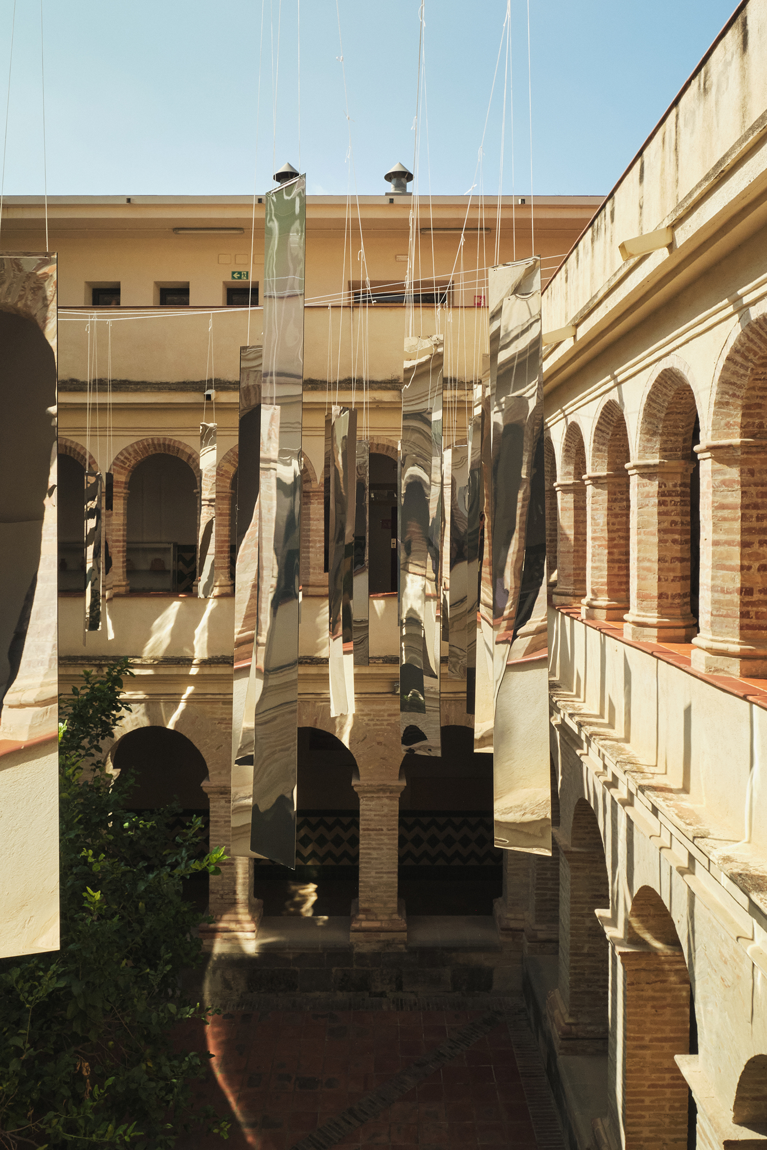 The installation covers the interior perimeter of the patio with hanging repetitions of vertical rectangles that alter the depth and perspective of the space and its architectural details. Visitors find themselves facing their own image, not as mere spectators but rather as protagonists in a visual narrative that challenges their capacity to distinguish between the real and the reflected.