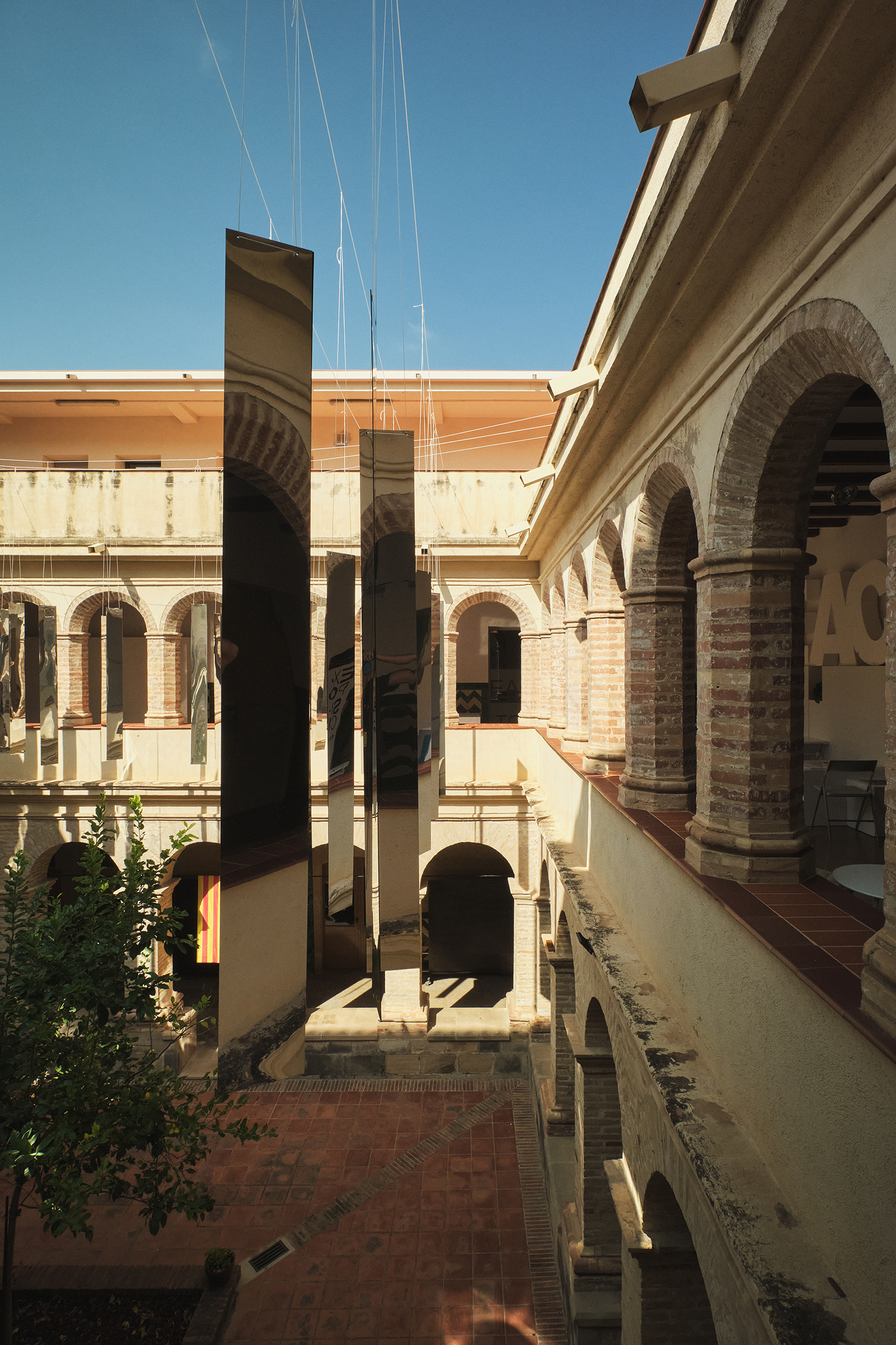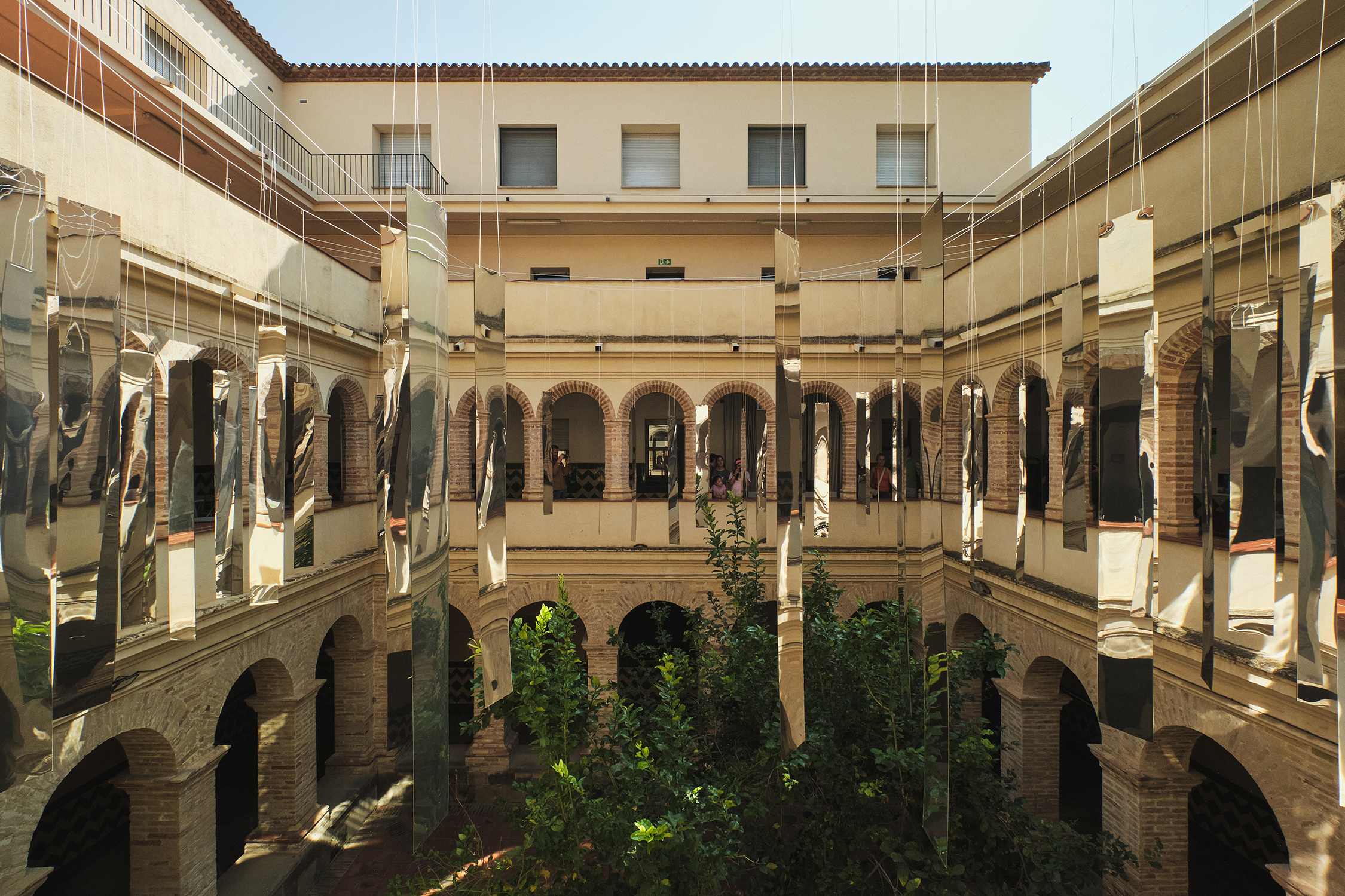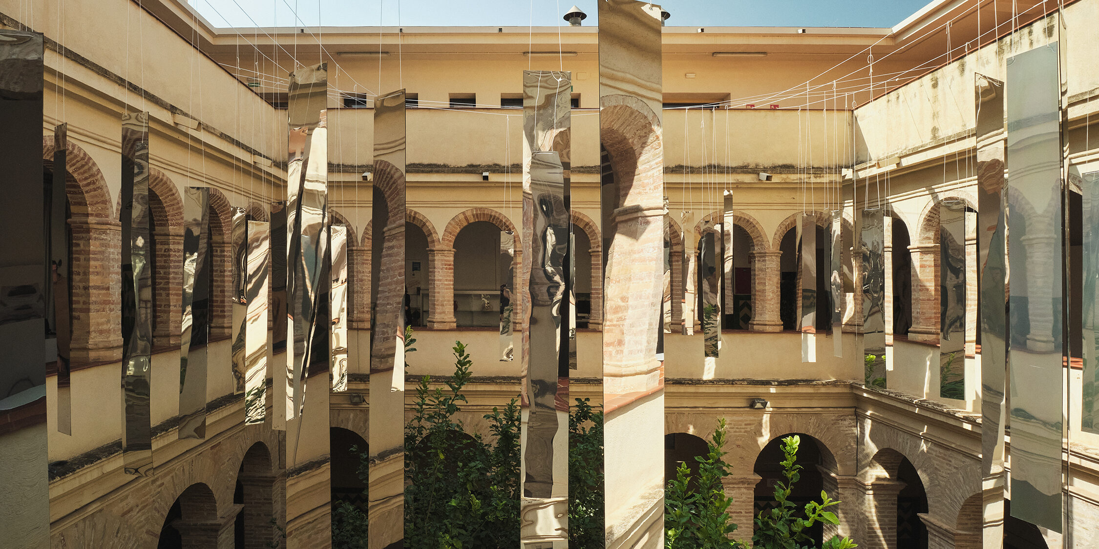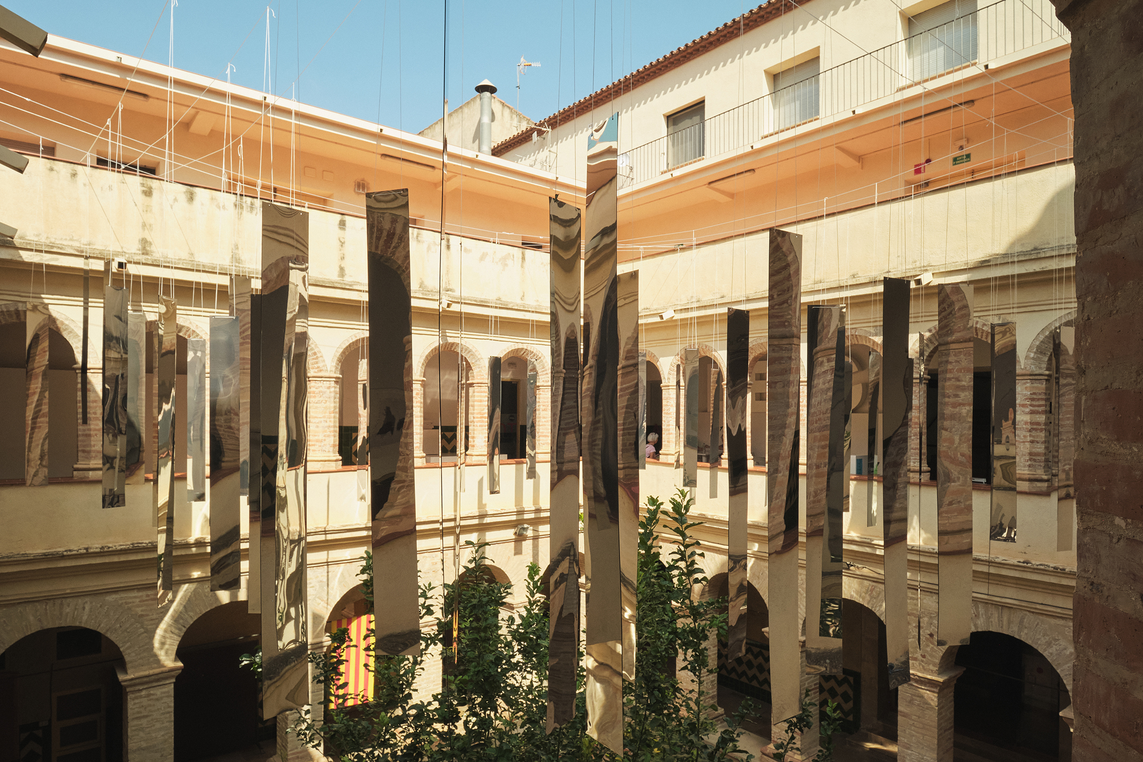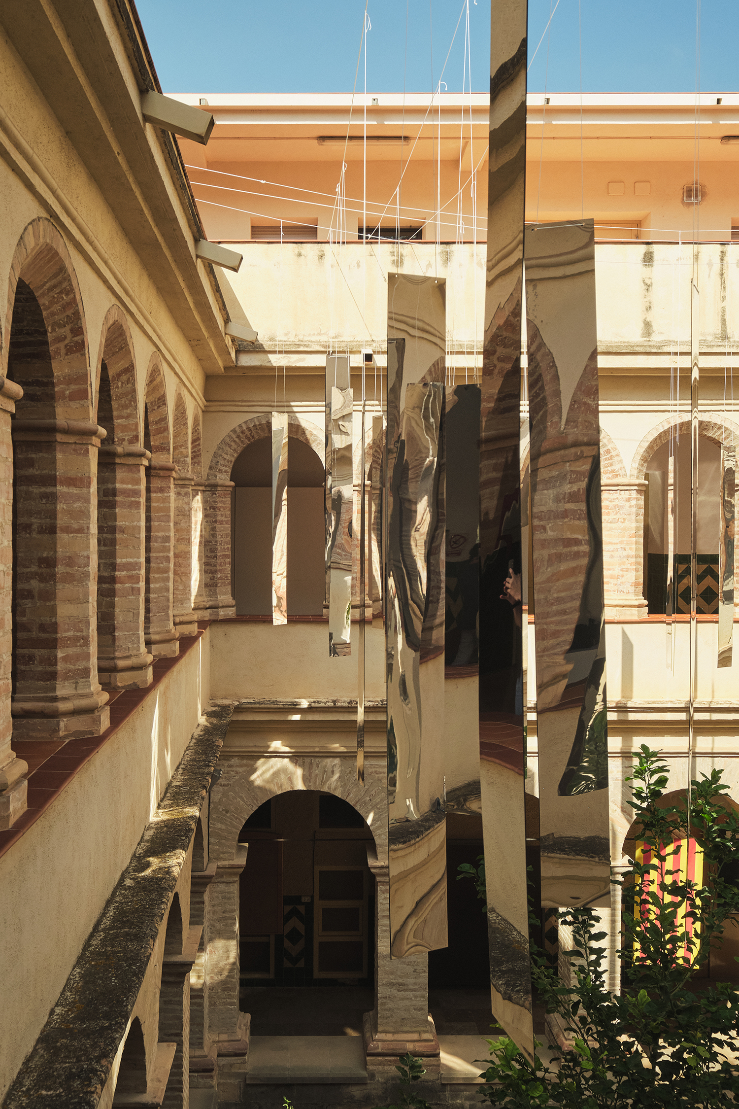 The installation covers the interior perimeter of the patio with hanging repetitions of vertical rectangles that alter the depth and perspective of the space and its architectural details. Visitors find themselves facing their own image, not as mere spectators but rather as protagonists in a visual narrative that challenges their capacity to distinguish between the real and the reflected.