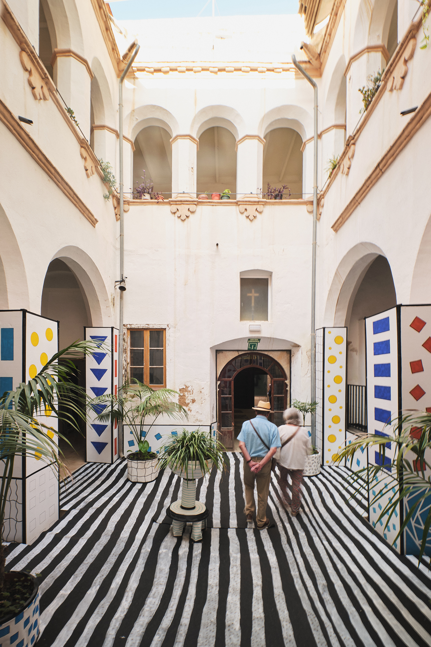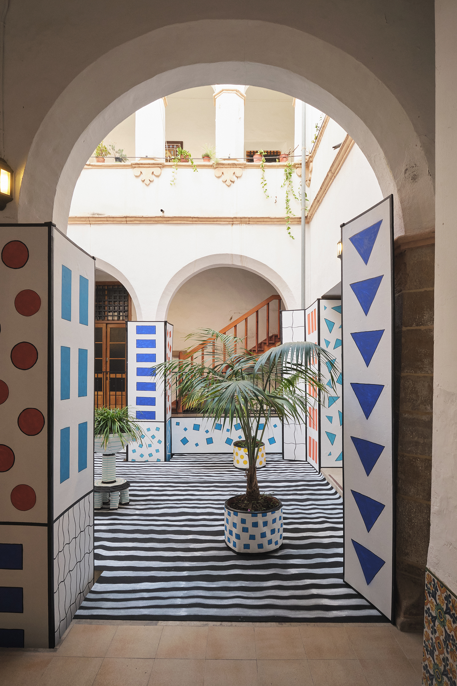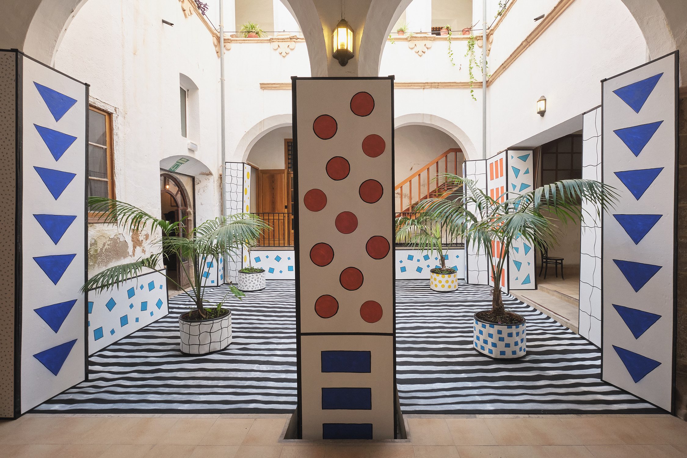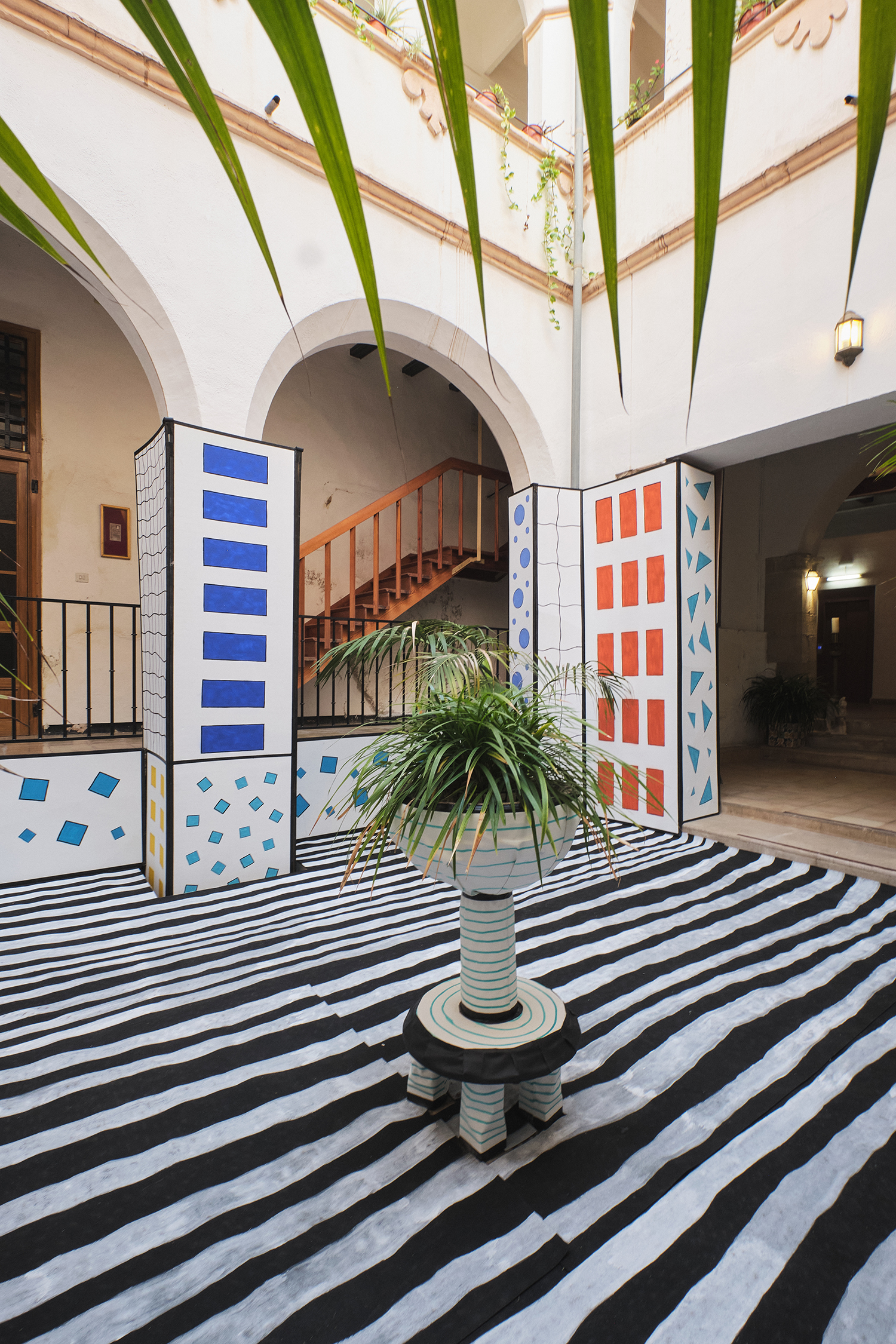 The artist transforms the true image of the patio, playing with the perception of reality by creating the illusion of being inside a drawn space.
