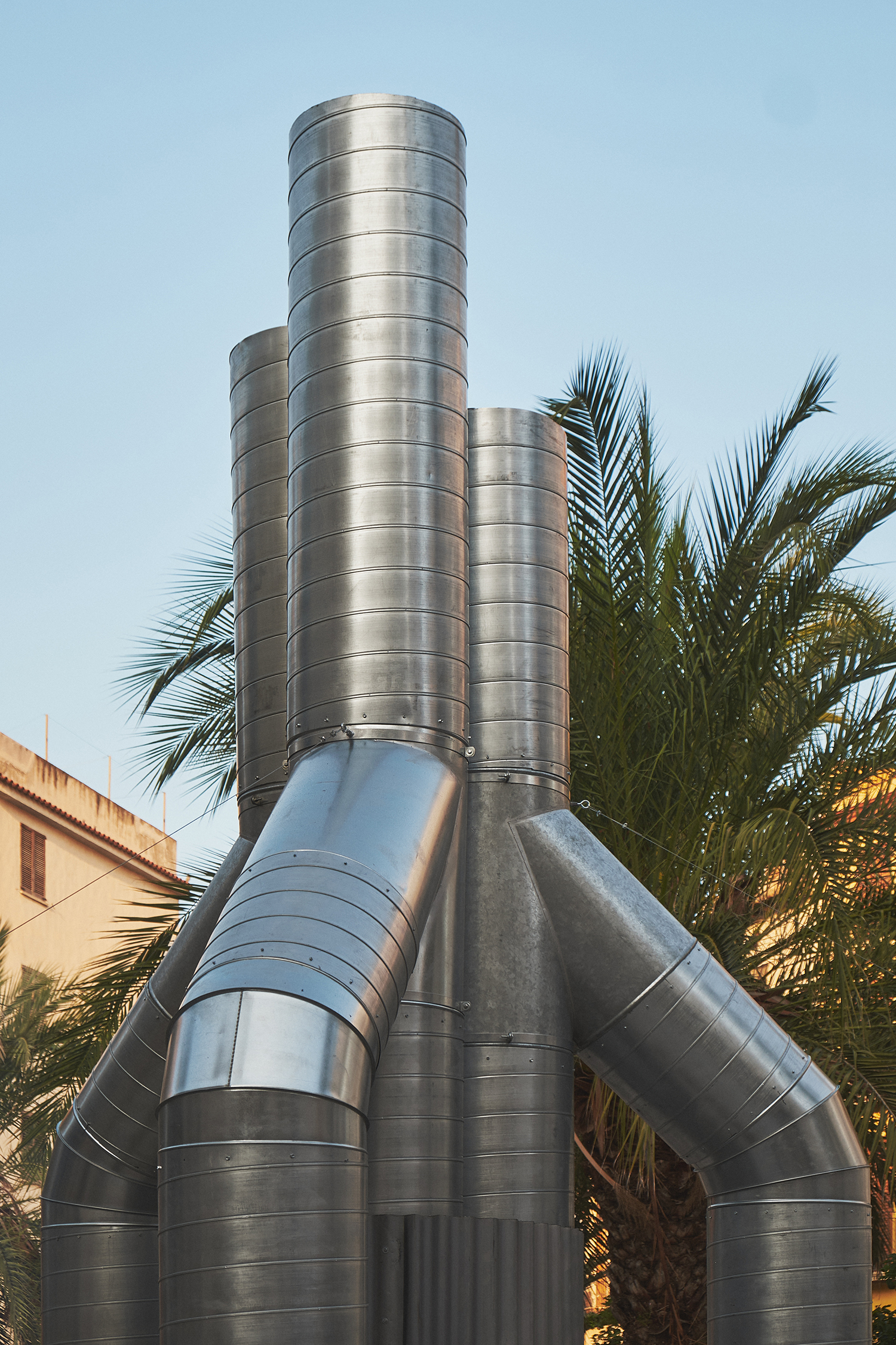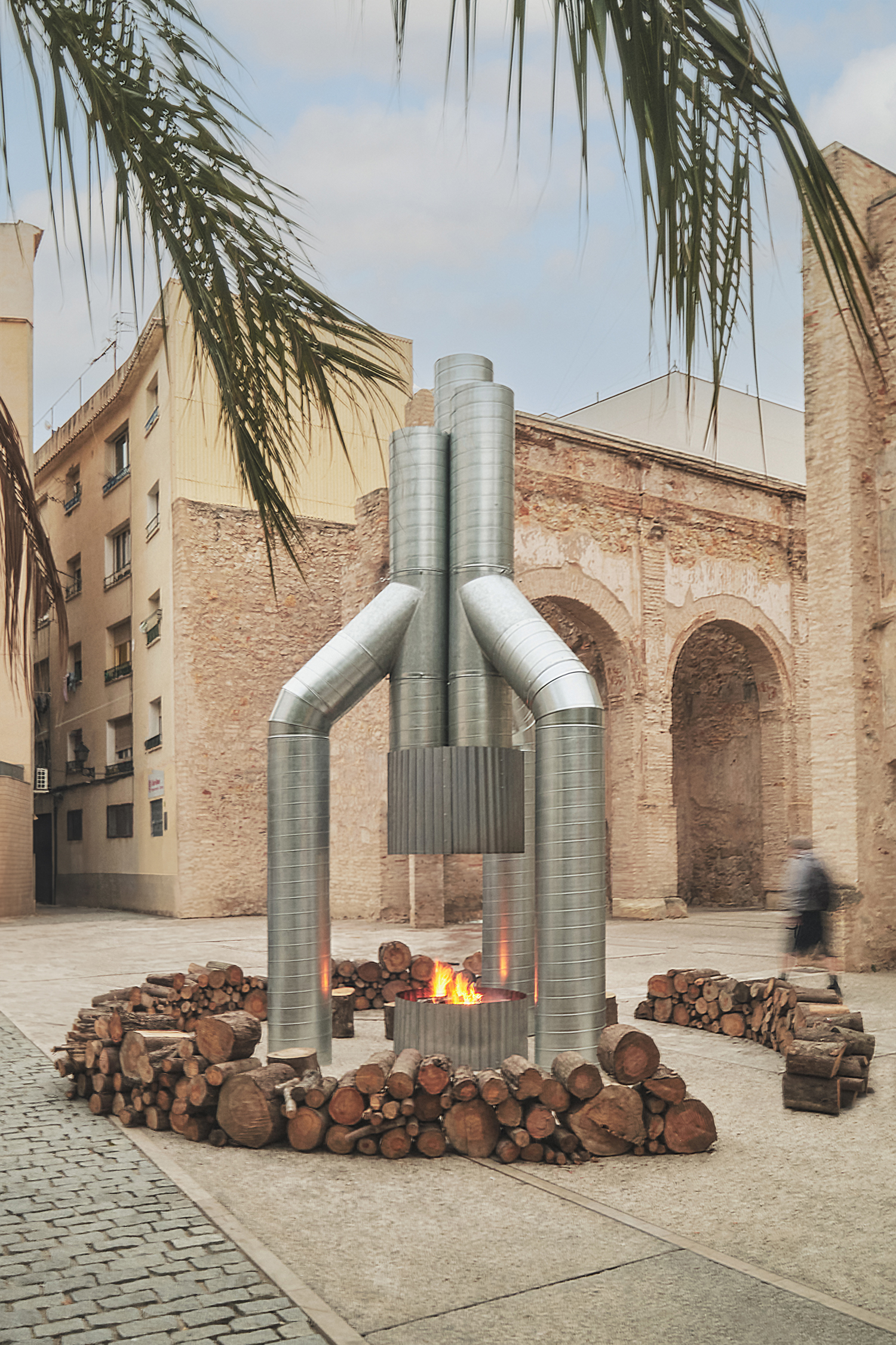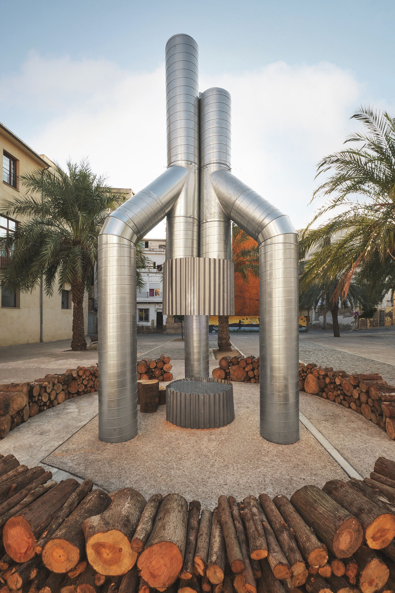 Merma is a structure supported by blocks of logs which are steadily consumed. An installation that seeks to create a collective gathering around fire and which generates a column of smoke, an ephemeral summons to an event that is taking place. A landmark, a piece of urban furniture and an action that celebrates the tenth edition of A Cel Obert. A volume that gradually shrinks as the festival progresses; an object in fragile balance that ends in its minimal expression.