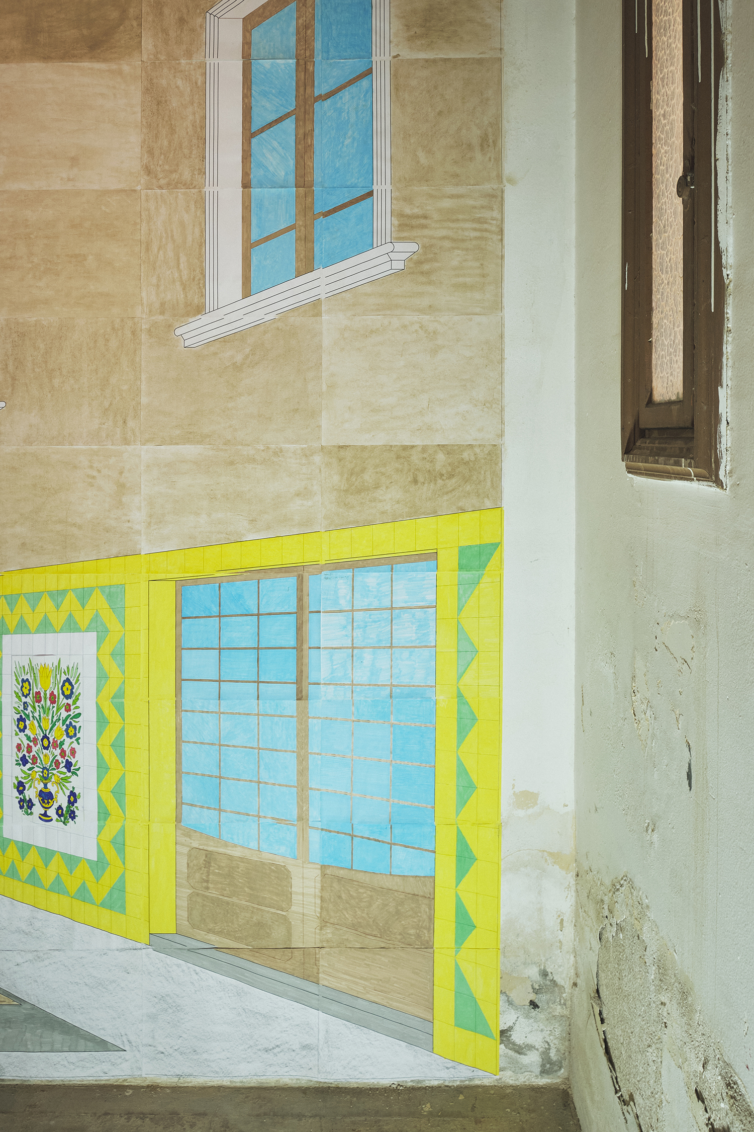Sin embargo, este año, tenemos un pedazo del patio del Palau Capmany en el almacén de la antigua fábrica de Olis Bau. Se ha creado un mural que representa una parte de este espacio, mediante un collage colaborativo realizado por alumnos del INS Les Planes.