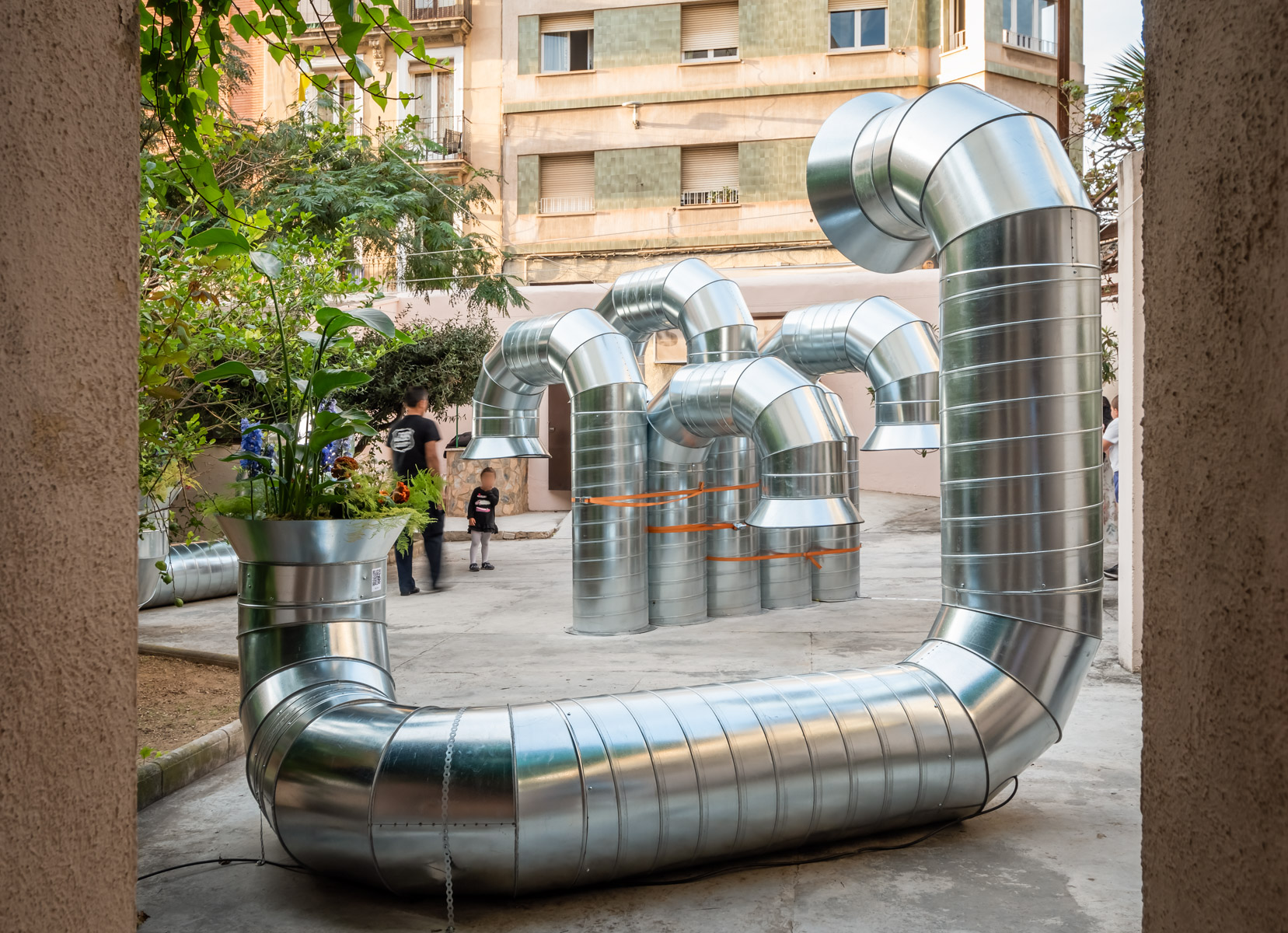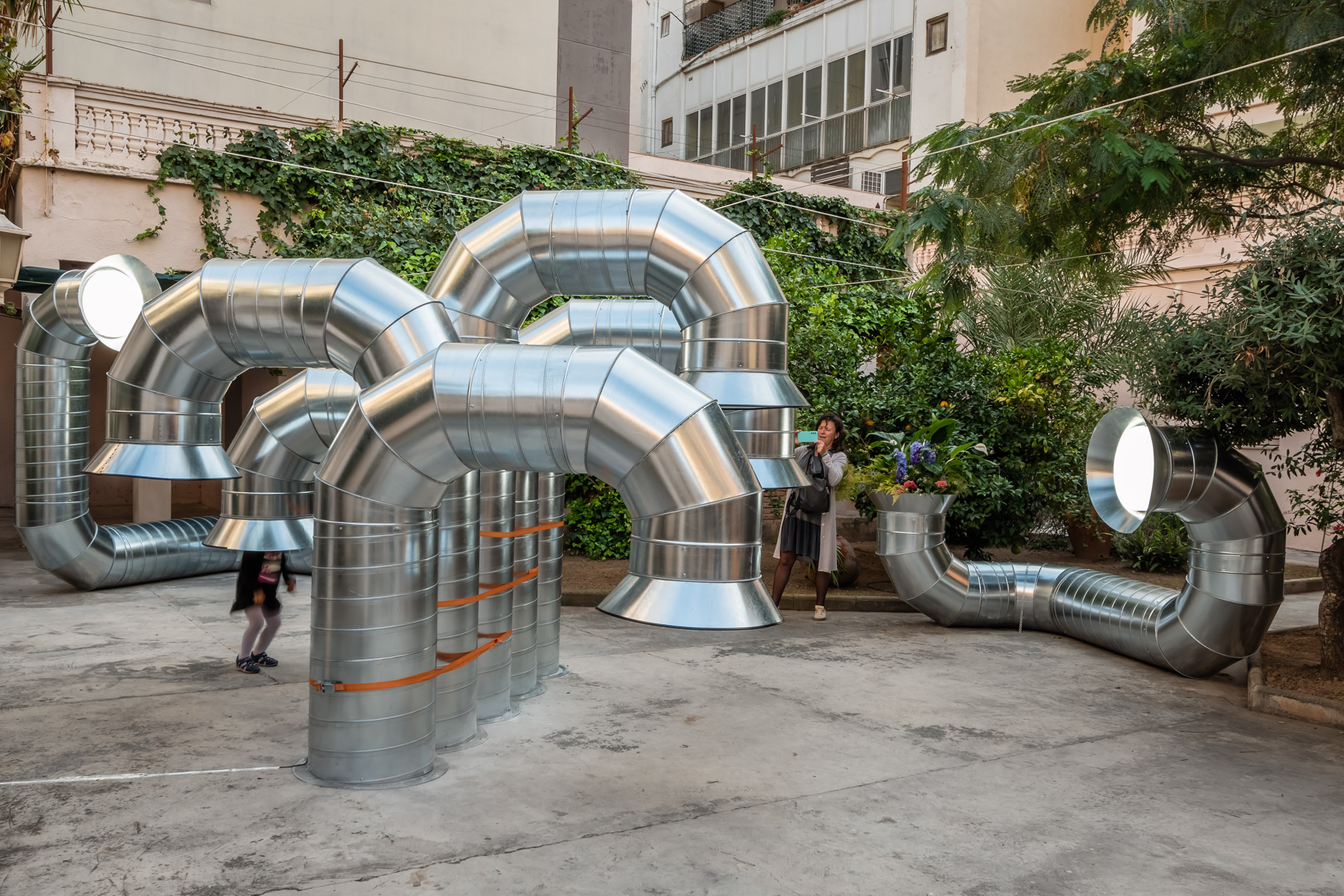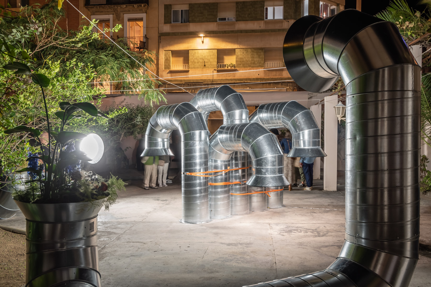 Inspirada por el concepto de intensidad, esta obra es un oasis de calma en medio del bullicio del festival. Los módulos de conductos de ventilación, dispuestos como arcos acogedores, se erigen como santuarios personales donde cada visitante puede sumergirse en un silencio profundo, lejos de la vorágine exterior. En estos refugios, se crea un espacio de reflexión donde el susurro del silencio se convierte en un eco de la propia mente, permitiendo una pausa contemplativa en el frenesí del ritmo actual. Esta experiencia recuerda la serenidad evocada por el concepto japonés de ma, el cual describe la pausa significativa y el espacio entre los elementos, que otorgan sentido y profundidad a la totalidad.