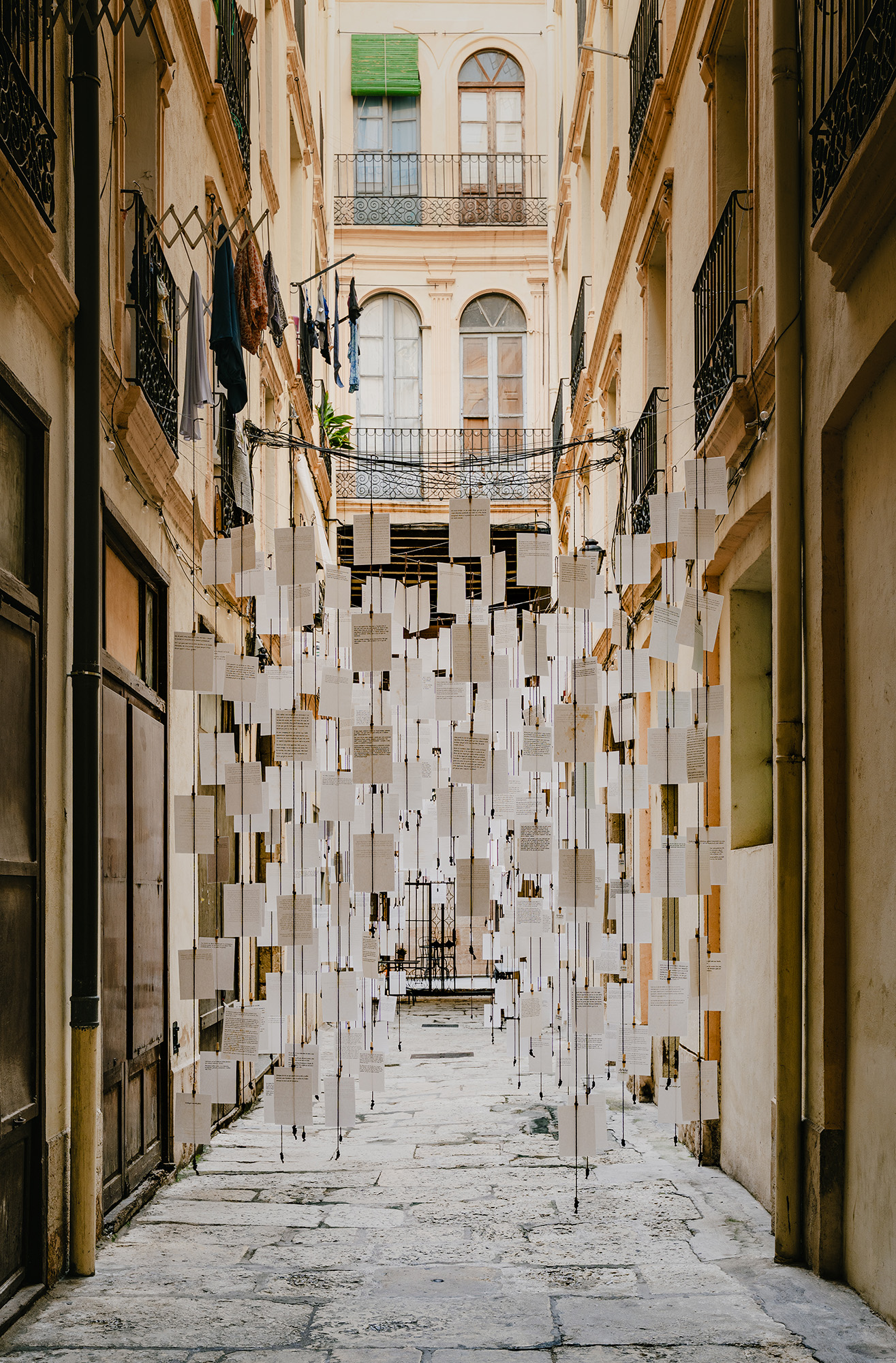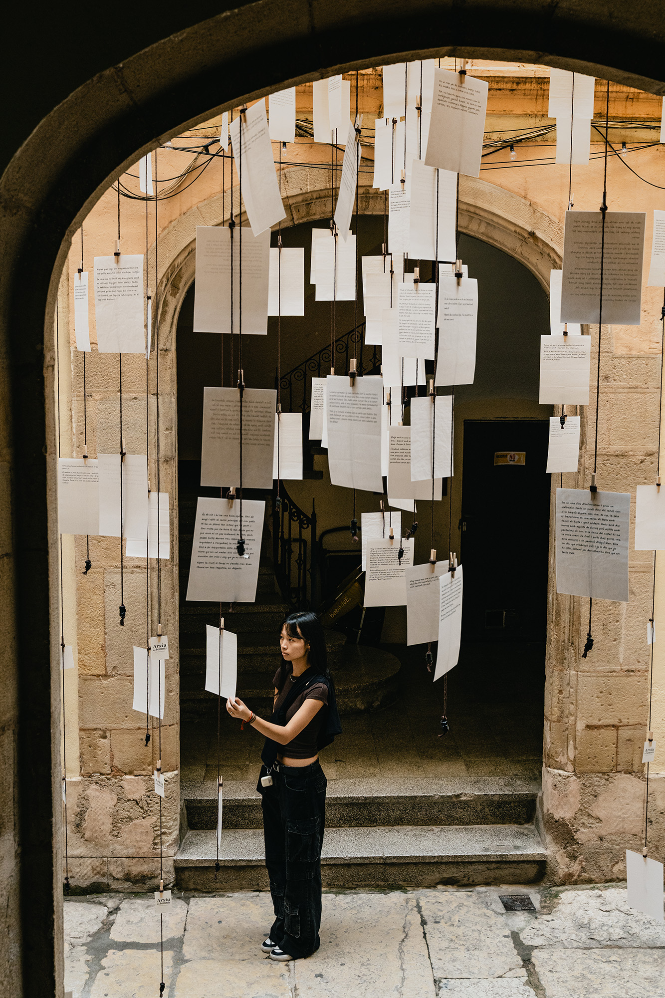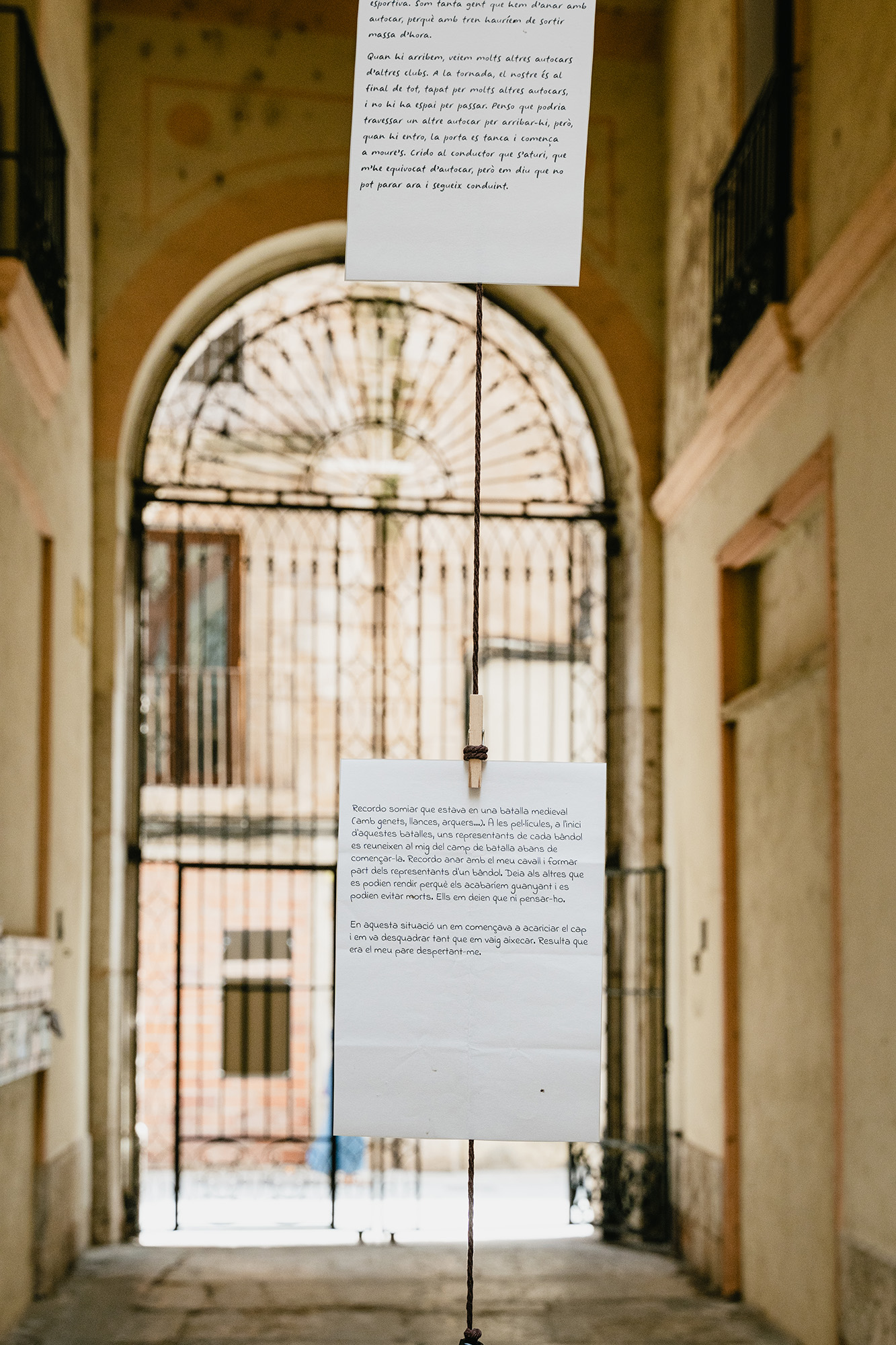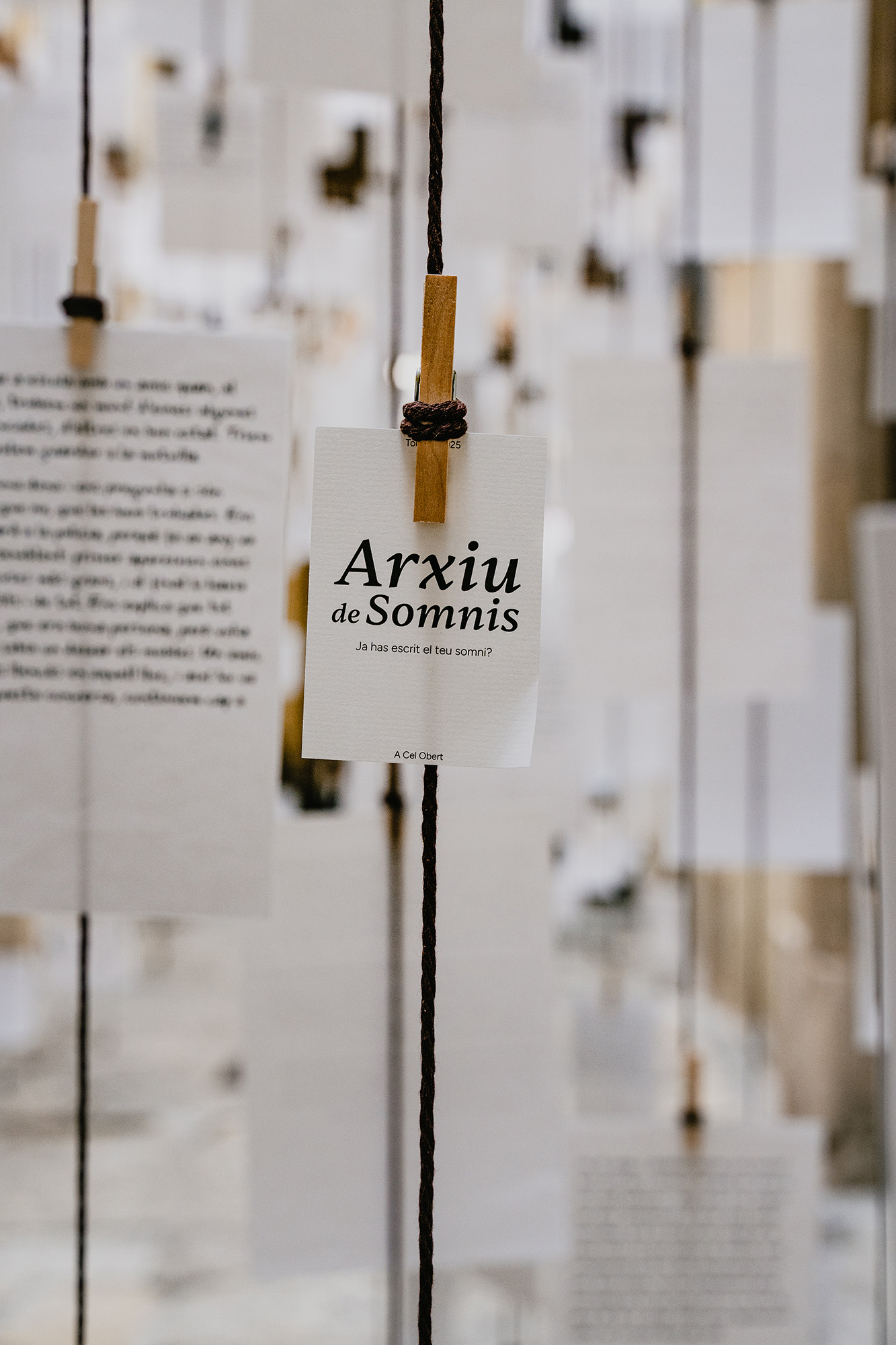 Arxiu de Somnis (“Archivo de Sueños”) transforma el espacio urbano en un colectivo de sueños compartidos. La obra consiste en cientos de papeles con sueños escritos suspendidos entre balcones, combinados con ropa semitransparente que representa los sueños hechos cuerpo. La instalación invita a los visitantes a entrar en este espacio onírico y participar activamente, dejando constancia de sus propios sueños.