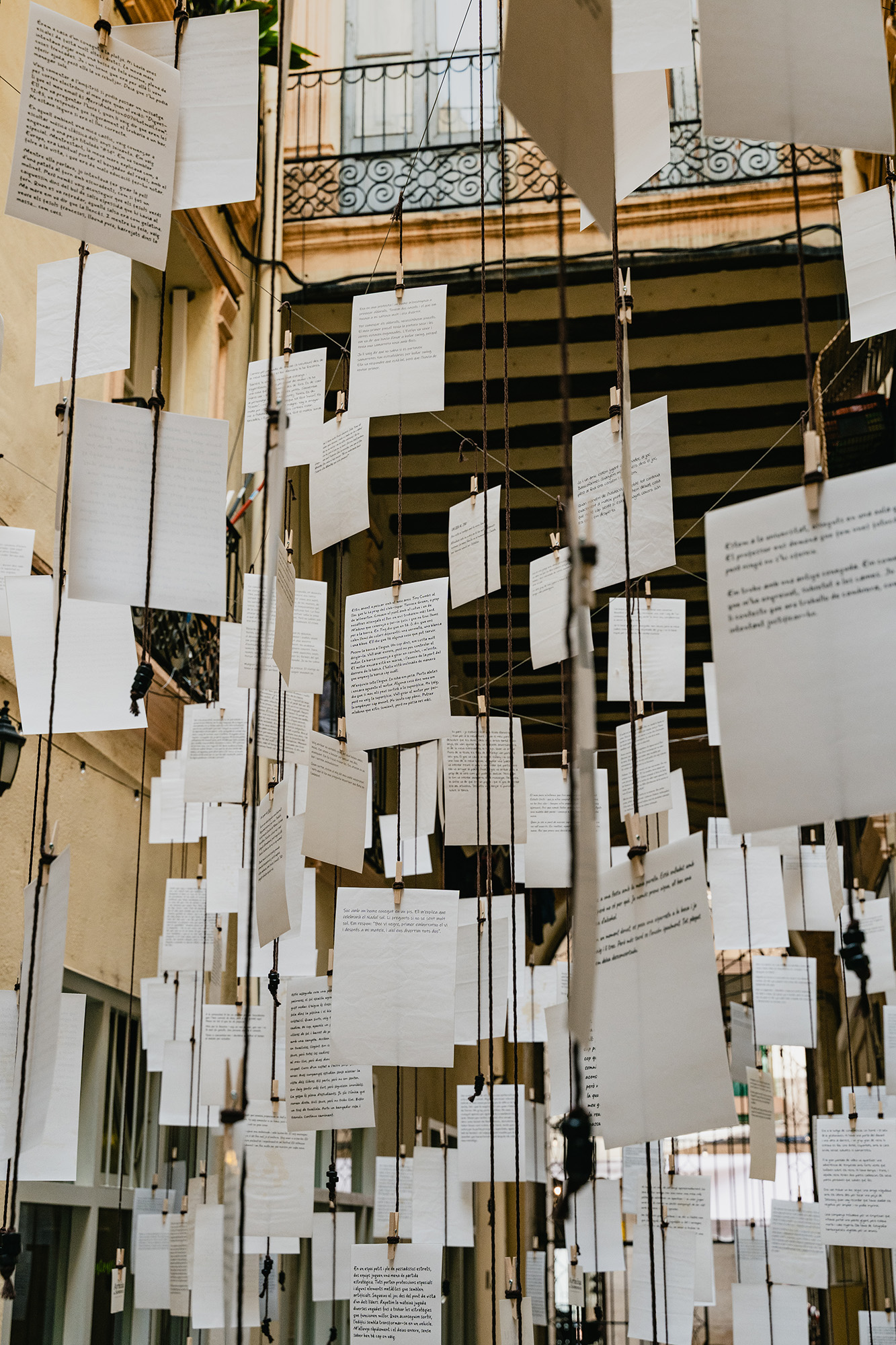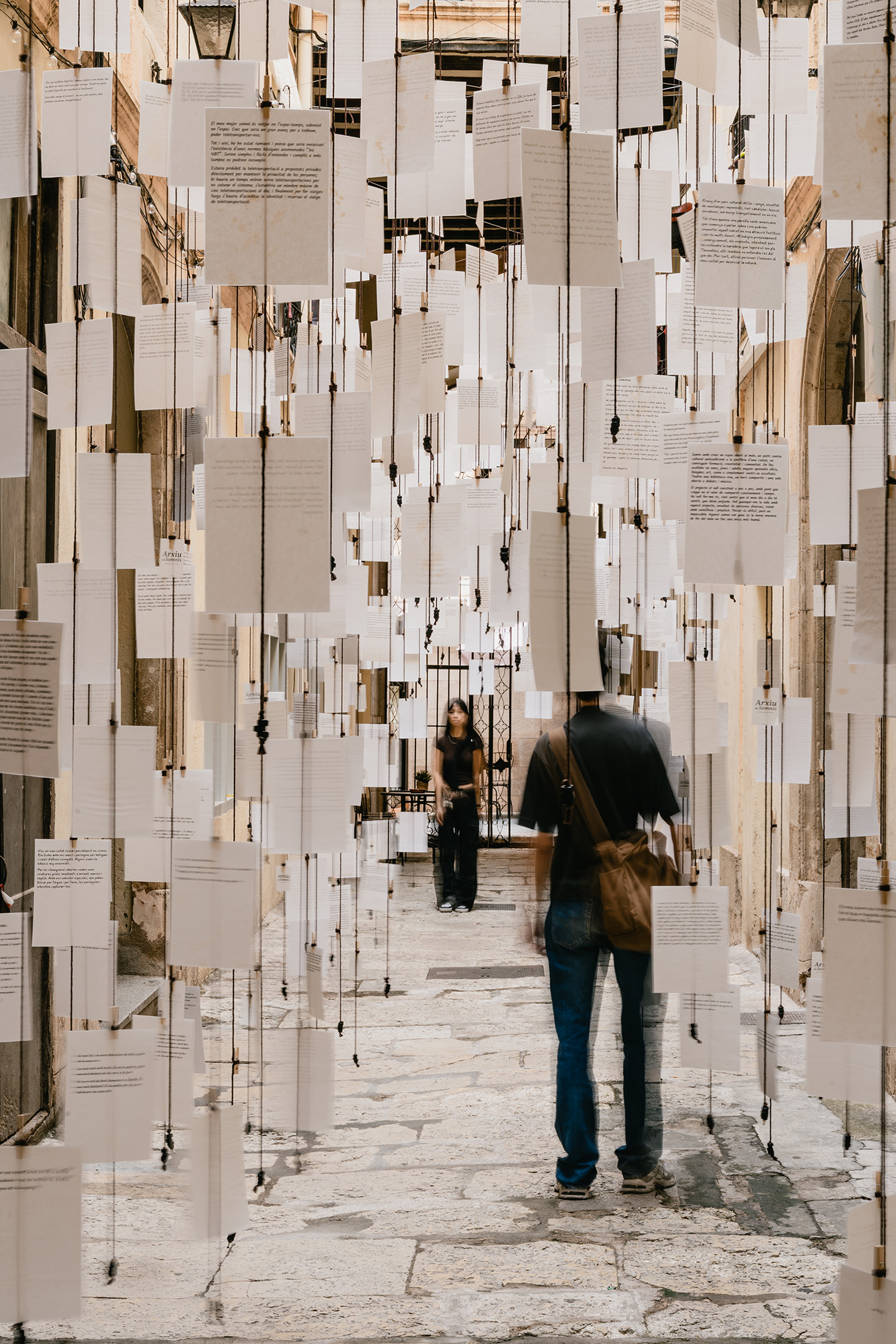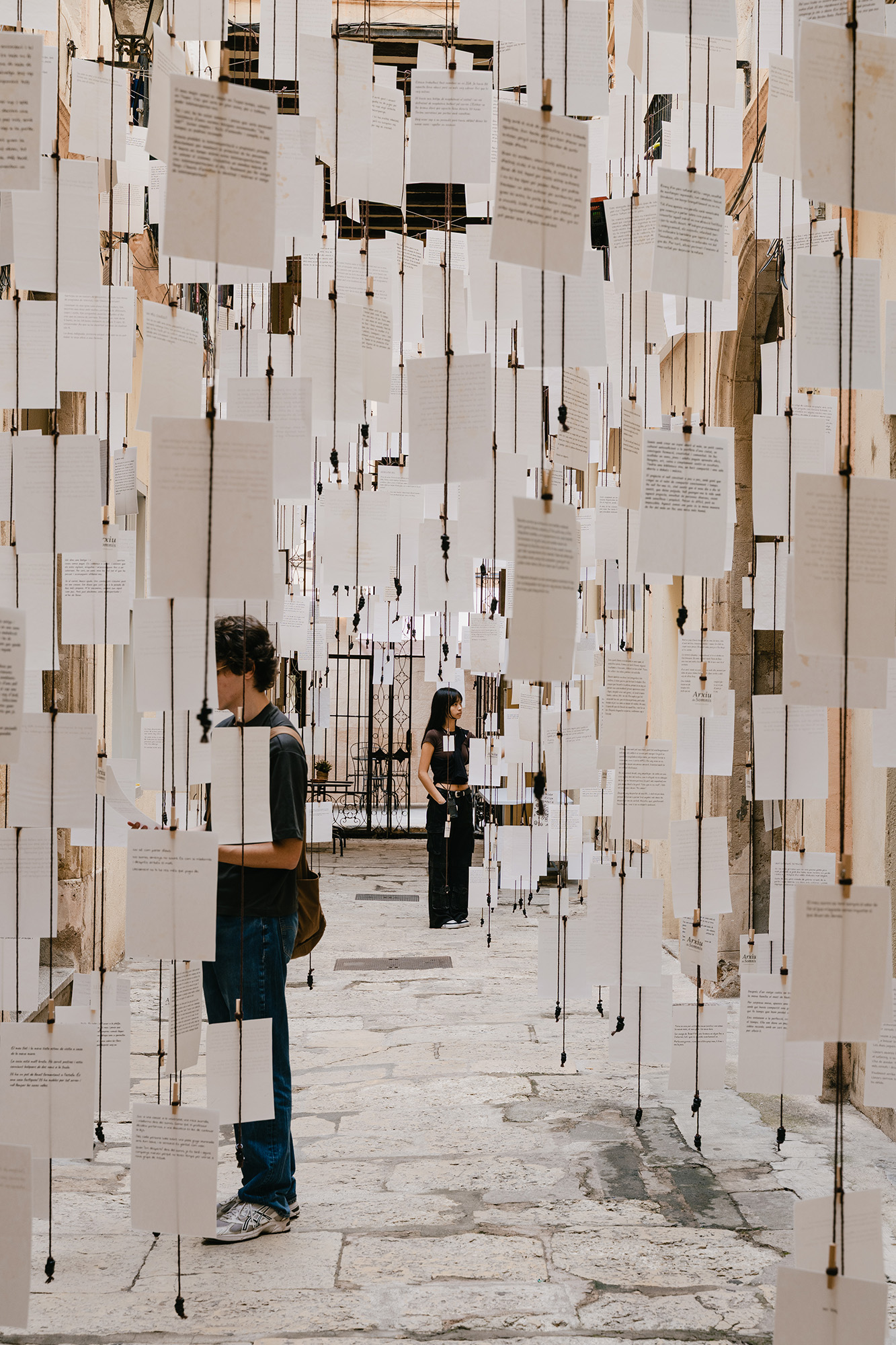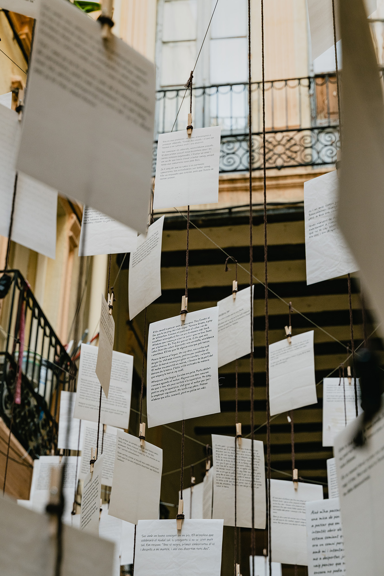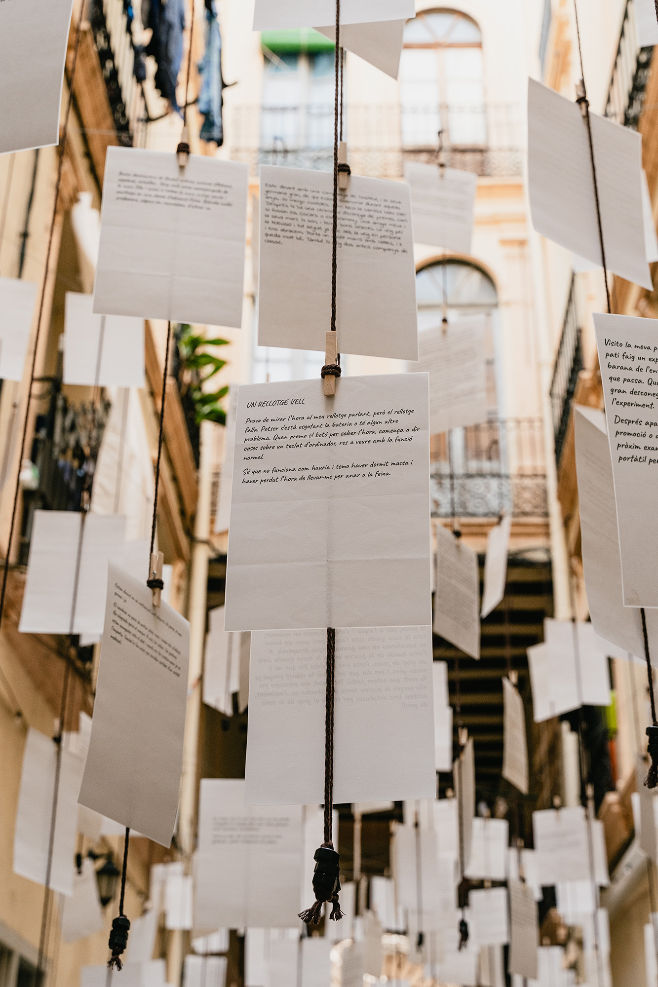 Arxiu de Somnis (“Archivo de Sueños”) transforma el espacio urbano en un colectivo de sueños compartidos. La obra consiste en cientos de papeles con sueños escritos suspendidos entre balcones, combinados con ropa semitransparente que representa los sueños hechos cuerpo. La instalación invita a los visitantes a entrar en este espacio onírico y participar activamente, dejando constancia de sus propios sueños.