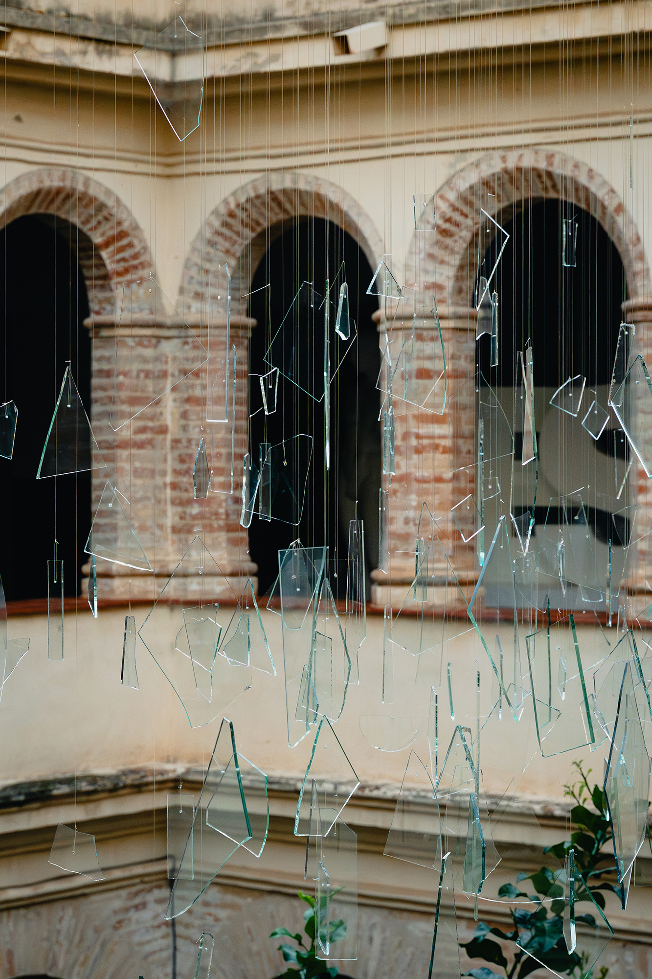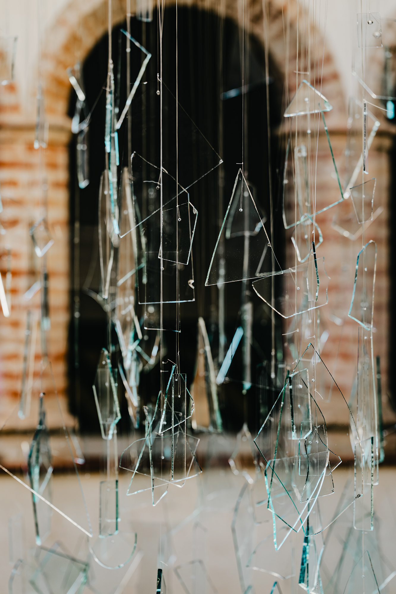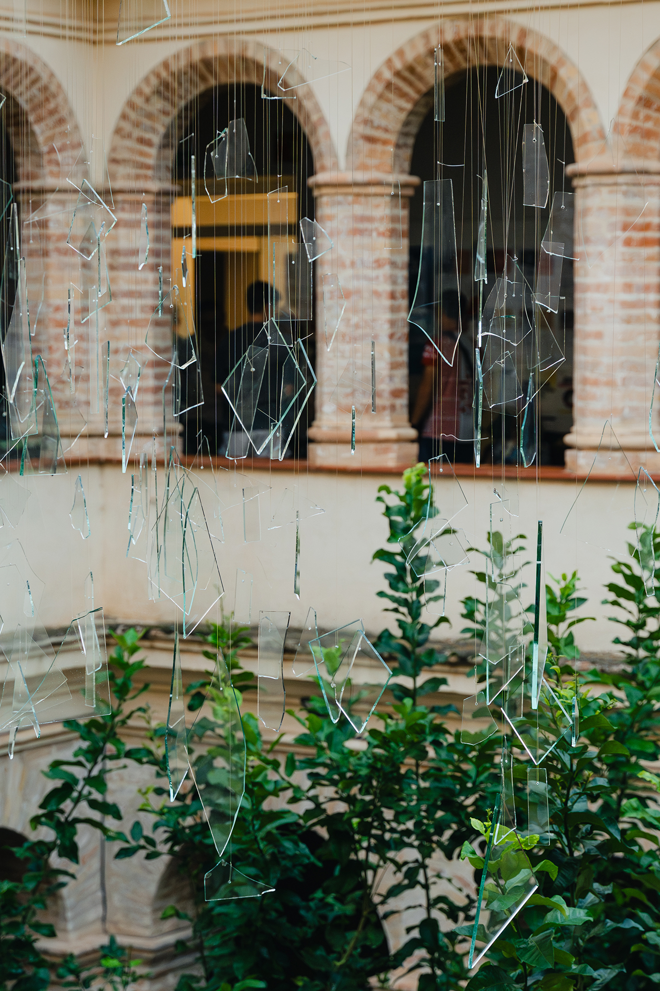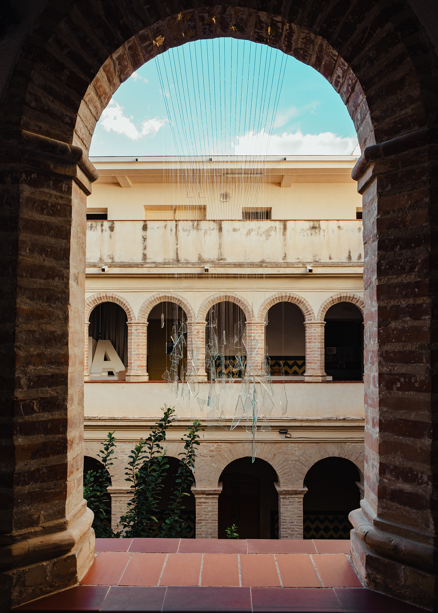 Las autoras han diseñado una instalación efímera suspendida en el aire formada por agrupaciones de pequeños trozos de vidrio colgando de hilos de acero, configurando formas que evocan nubes flotantes. Estas formas aéreas representan ese estado intangible y suspendido del sueño, donde la realidad se fragmenta y se transforma. La luz natural atraviesa los fragmentos de vidrio, proyectando reflejos y sombras que cambian a lo largo del día, como los propios sueños, que nunca son iguales y se disuelven al despertar. El espectador se encuentra inmerso en un mundo onírico donde puede andar entre nubes y atrapar instantes efímeros de luz y silencio.