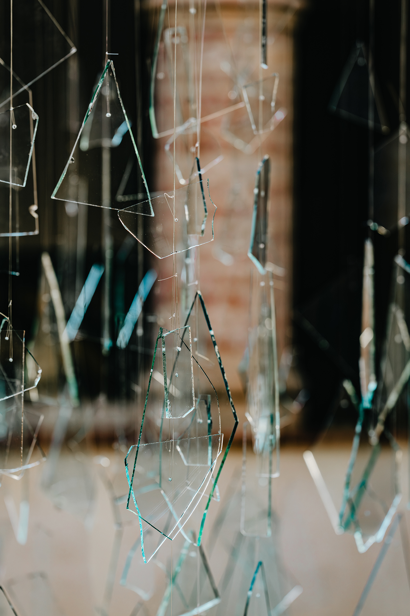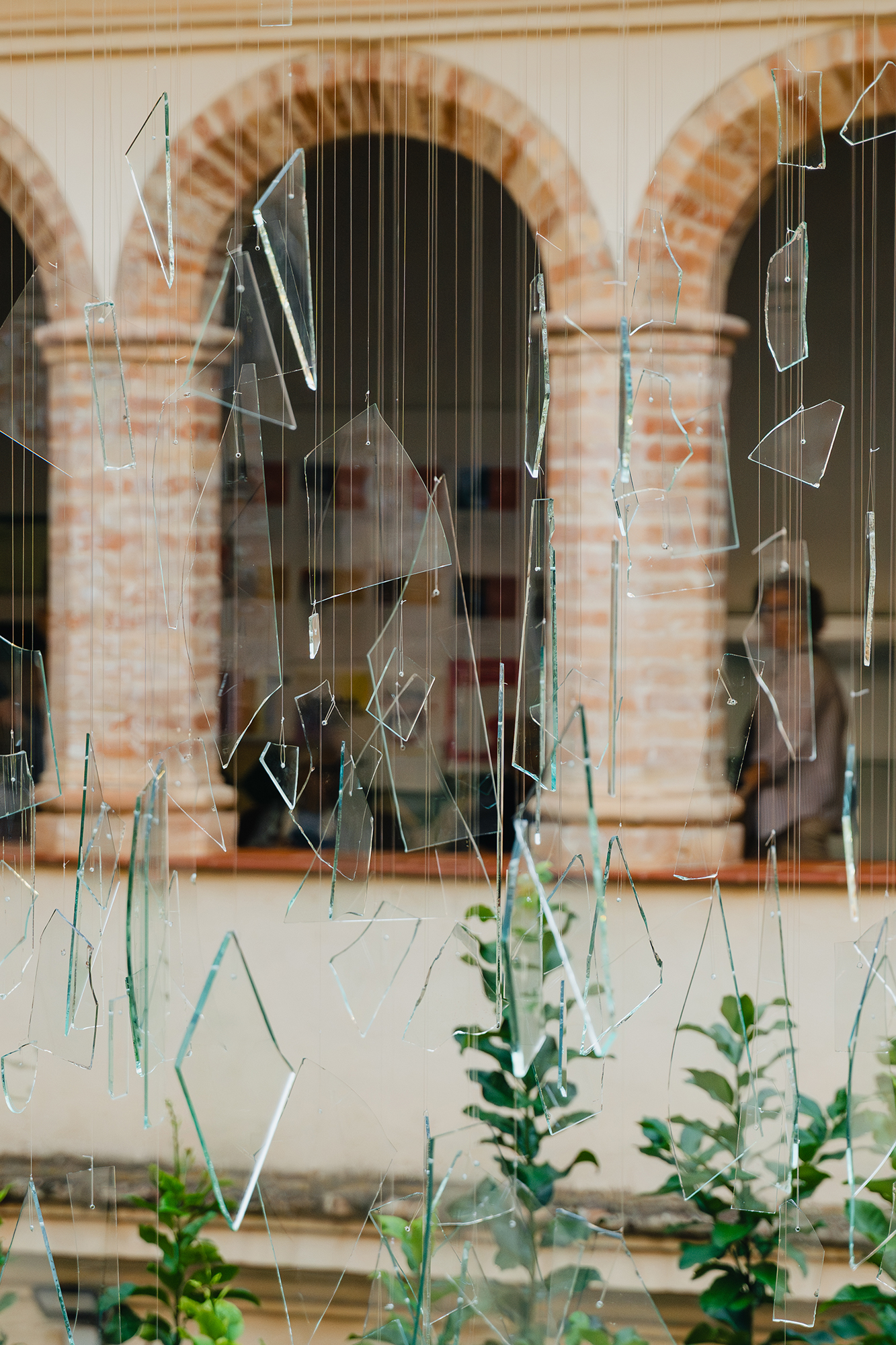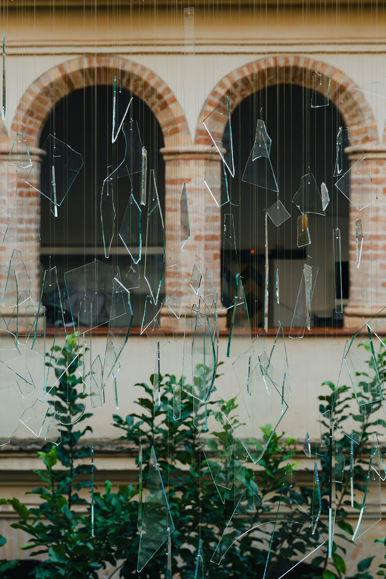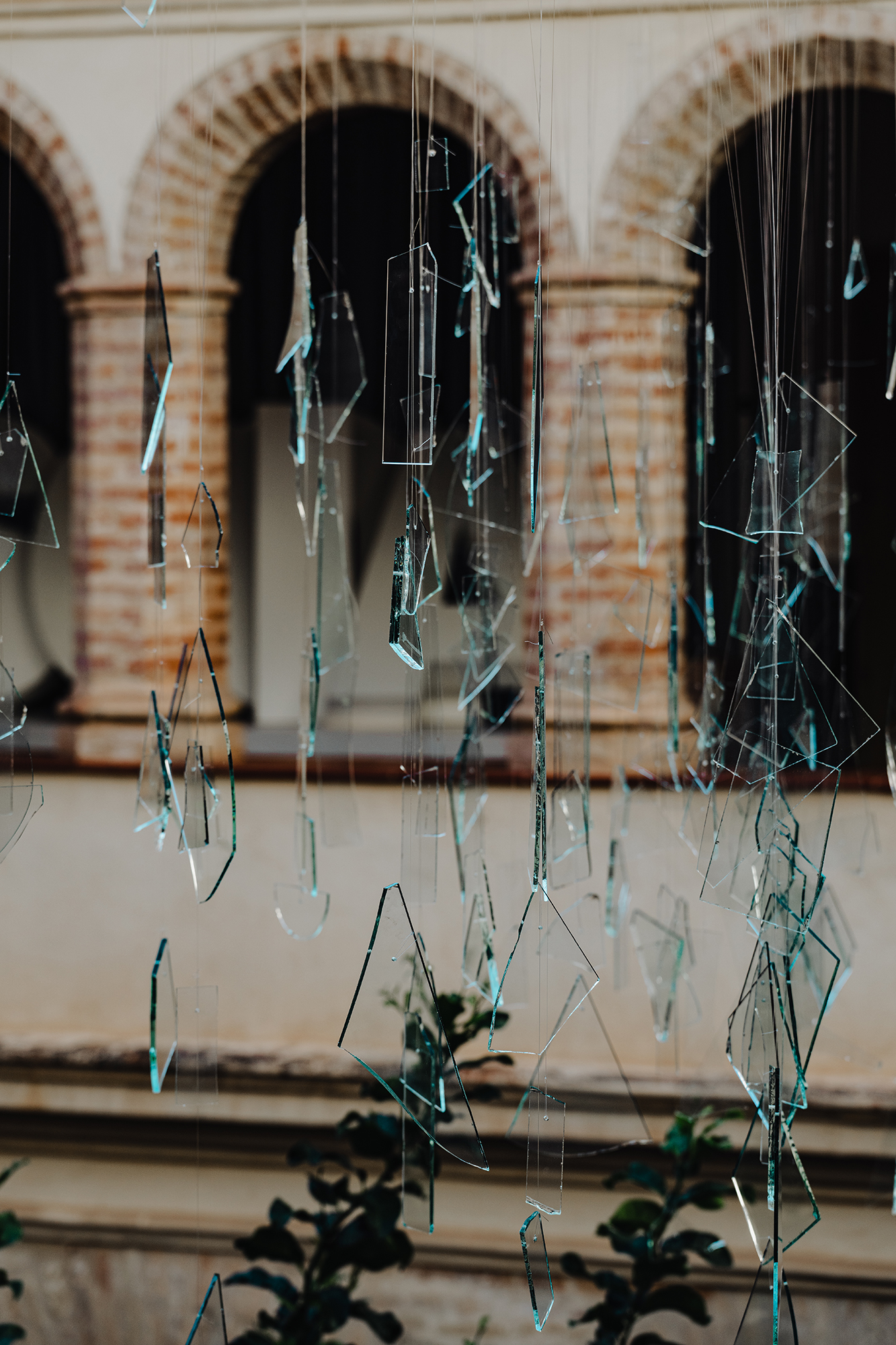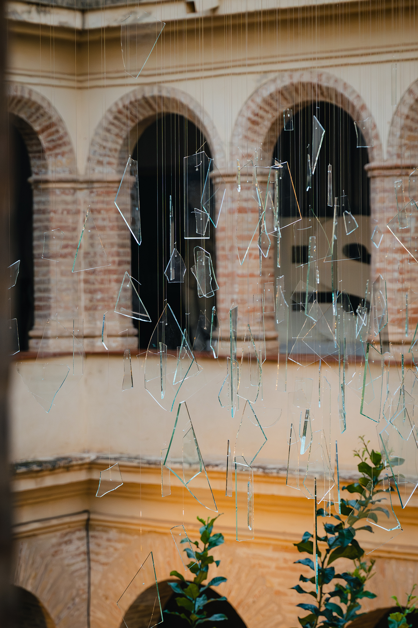 Las autoras han diseñado una instalación efímera suspendida en el aire formada por agrupaciones de pequeños trozos de vidrio colgando de hilos de acero, configurando formas que evocan nubes flotantes. Estas formas aéreas representan ese estado intangible y suspendido del sueño, donde la realidad se fragmenta y se transforma. La luz natural atraviesa los fragmentos de vidrio, proyectando reflejos y sombras que cambian a lo largo del día, como los propios sueños, que nunca son iguales y se disuelven al despertar. El espectador se encuentra inmerso en un mundo onírico donde puede andar entre nubes y atrapar instantes efímeros de luz y silencio.