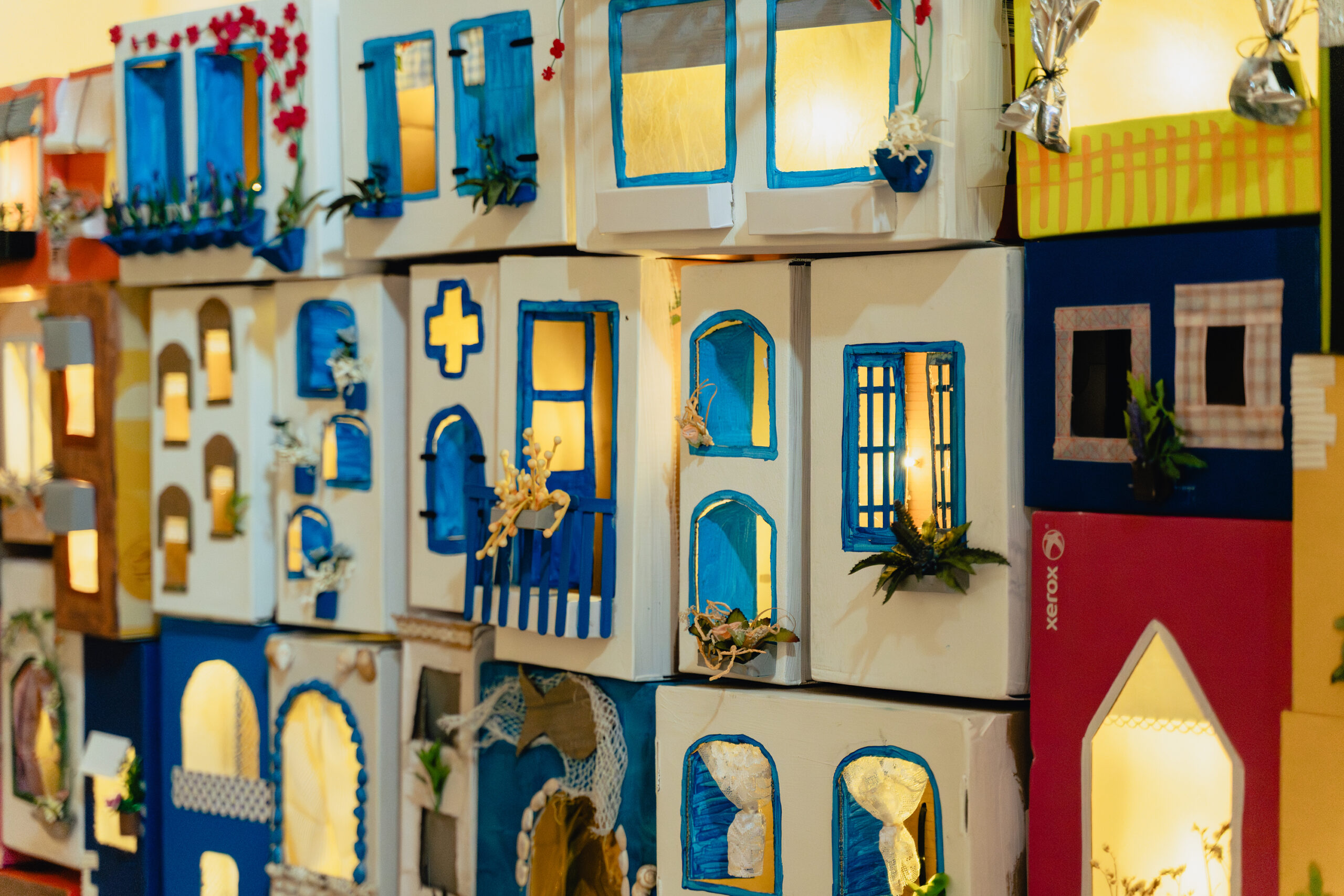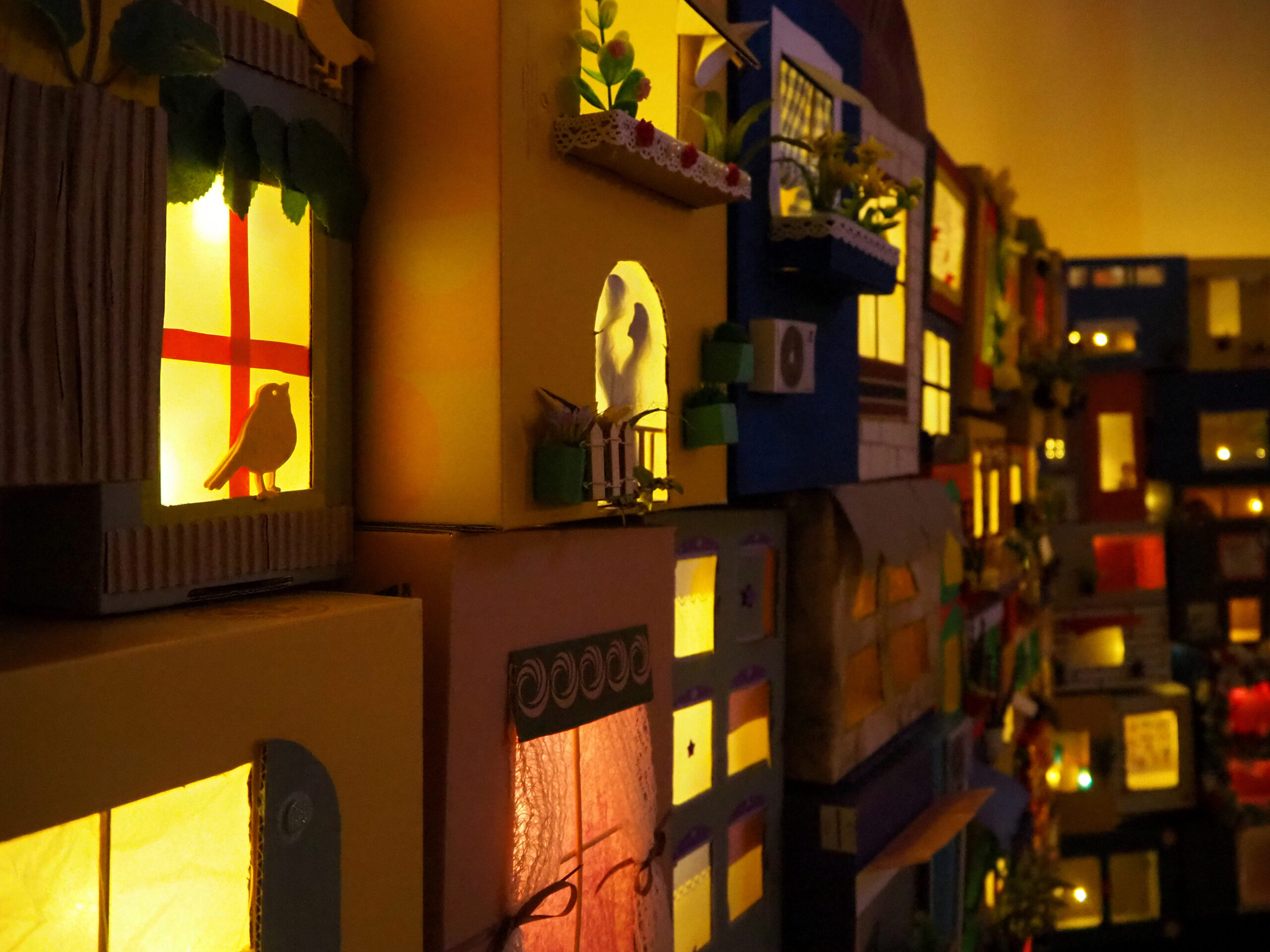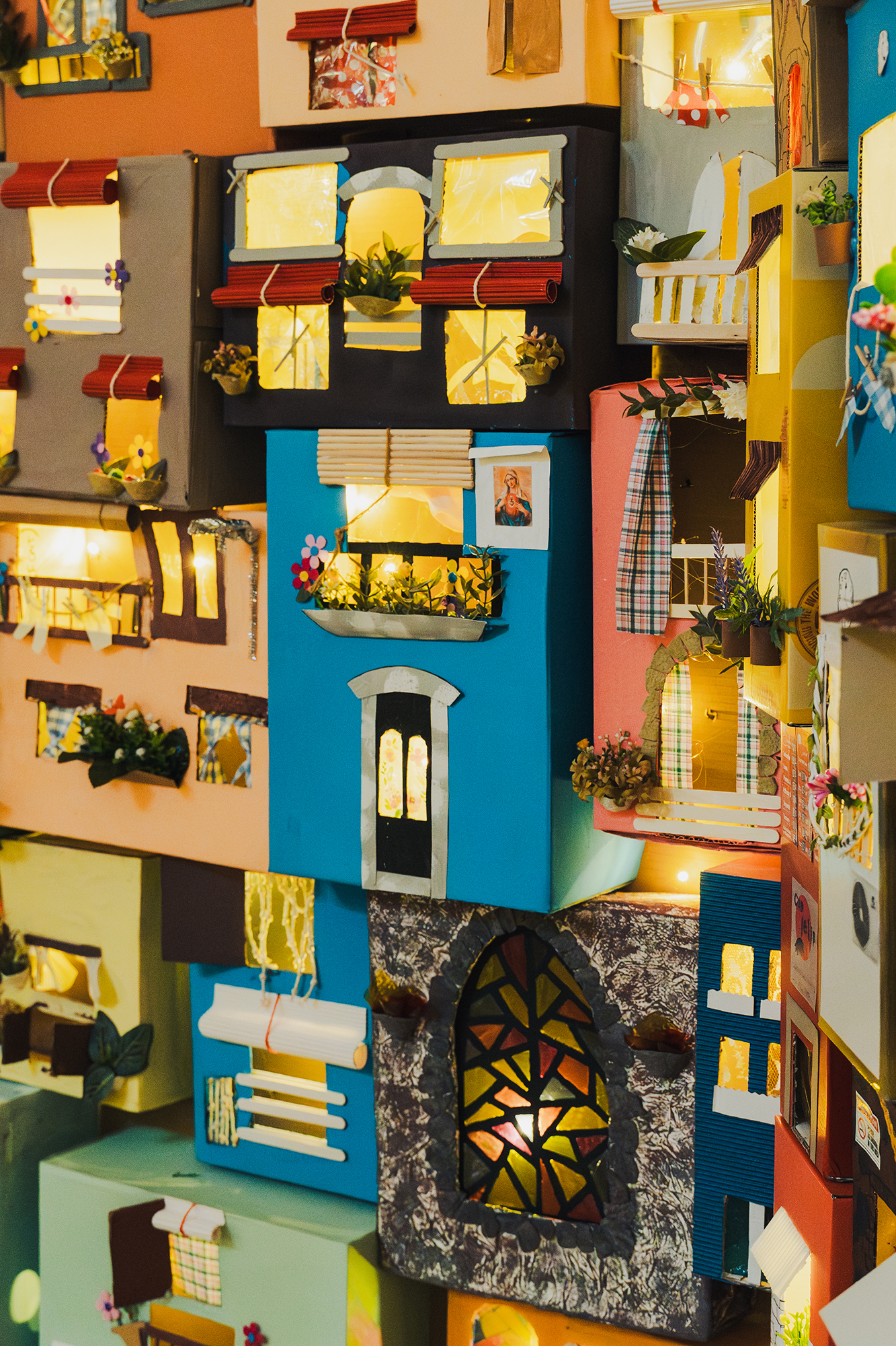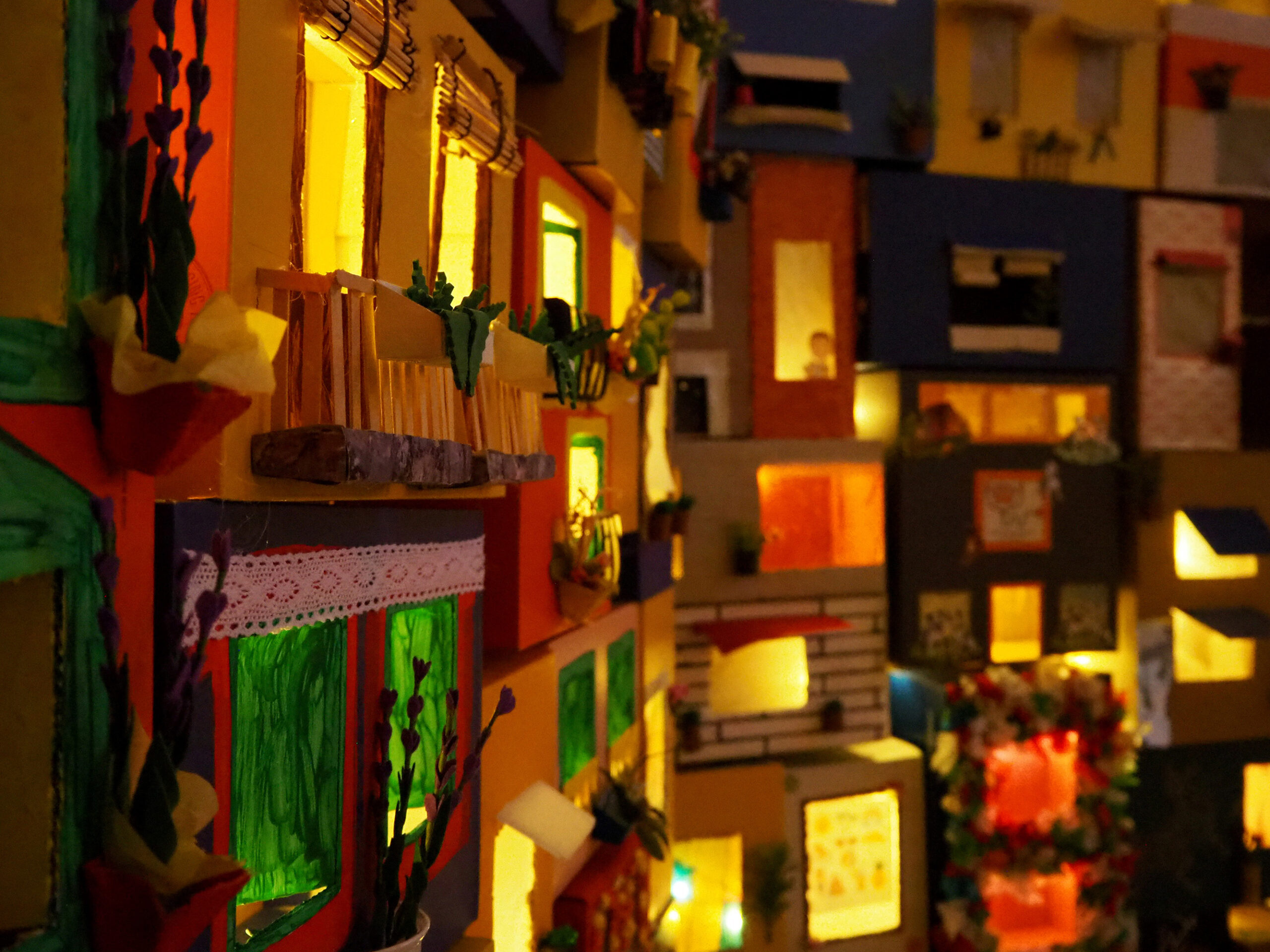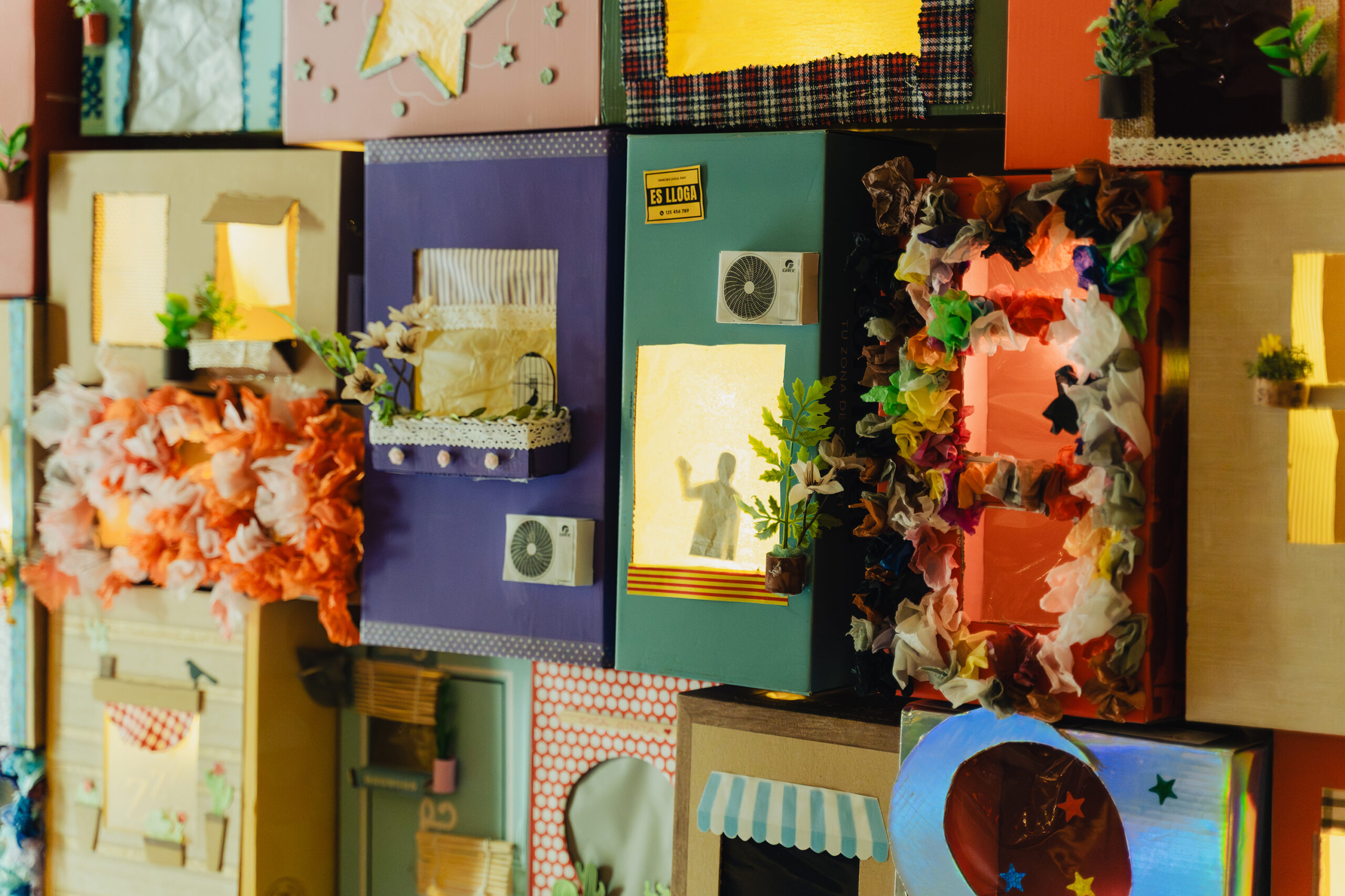 Cuando cae la noche, estas aberturas se convierten en protagonistas, iluminándose como pequeñas escenas que revelan la cotidianidad oculta detrás de los muros.