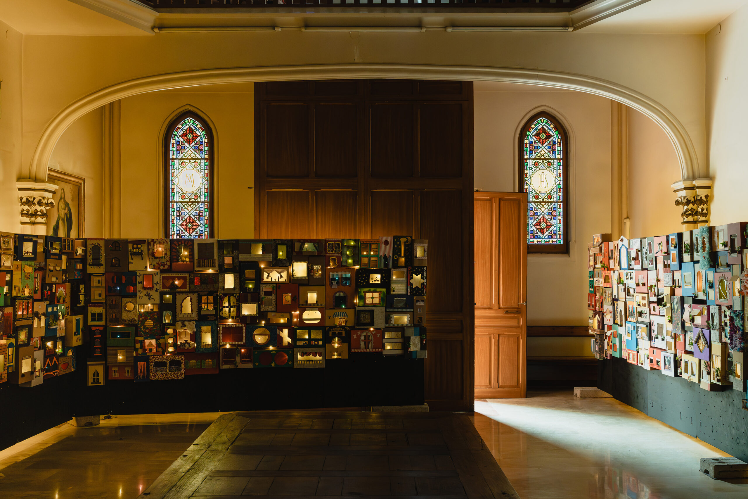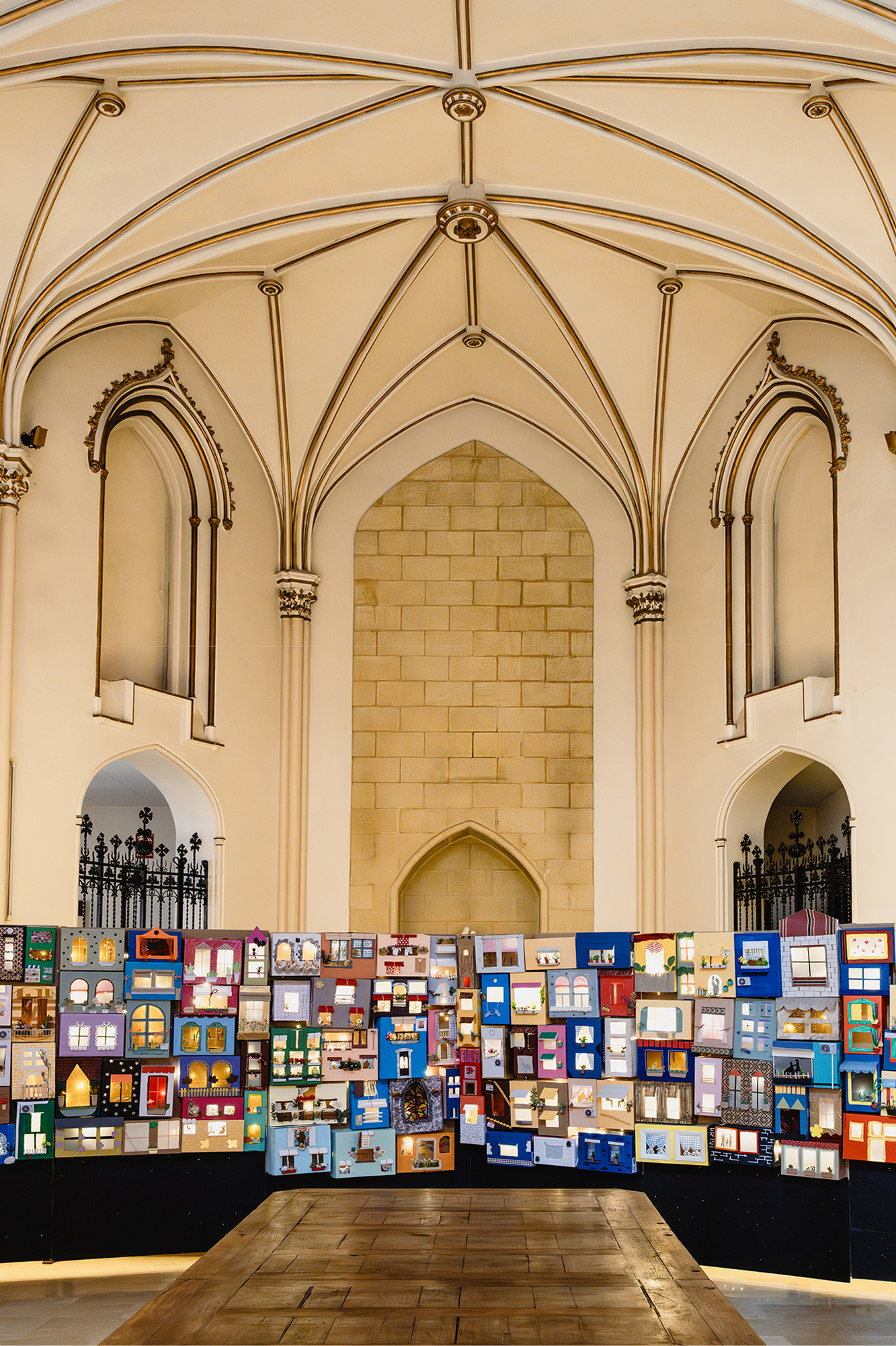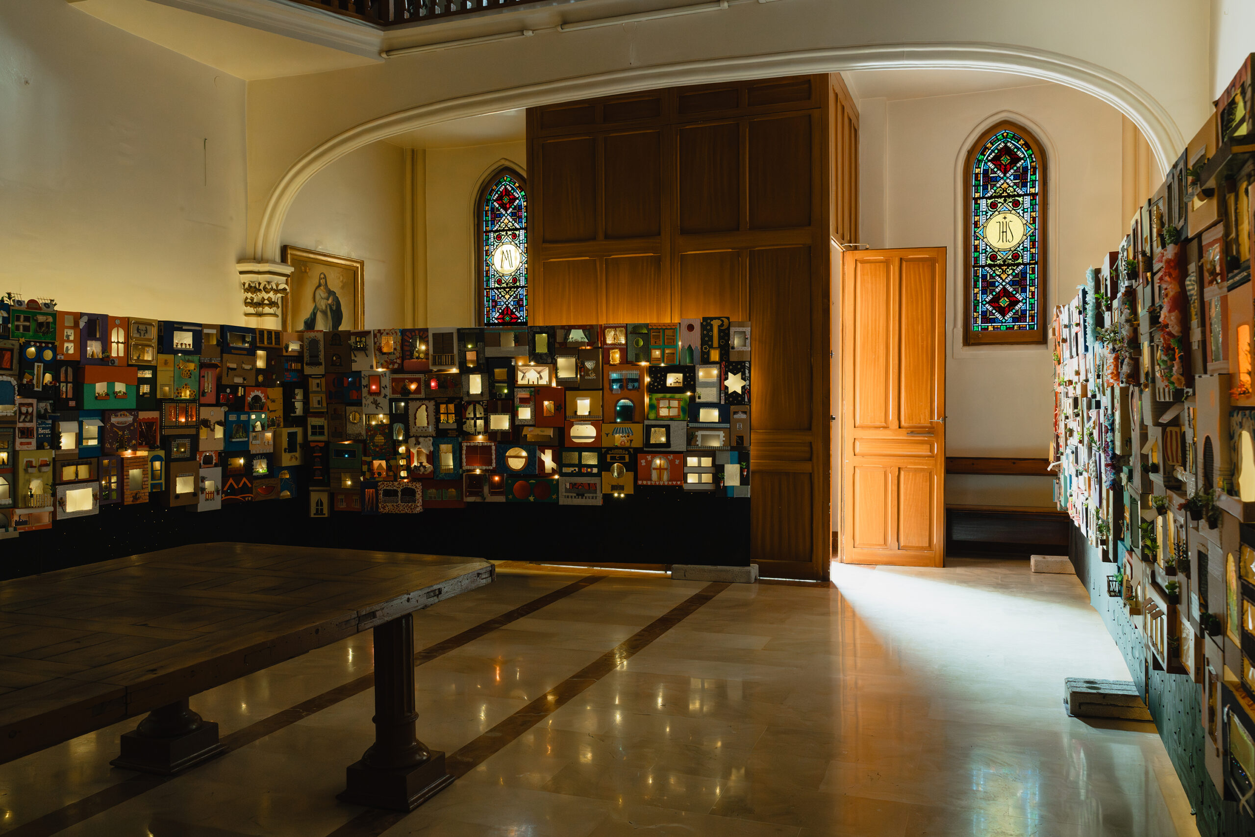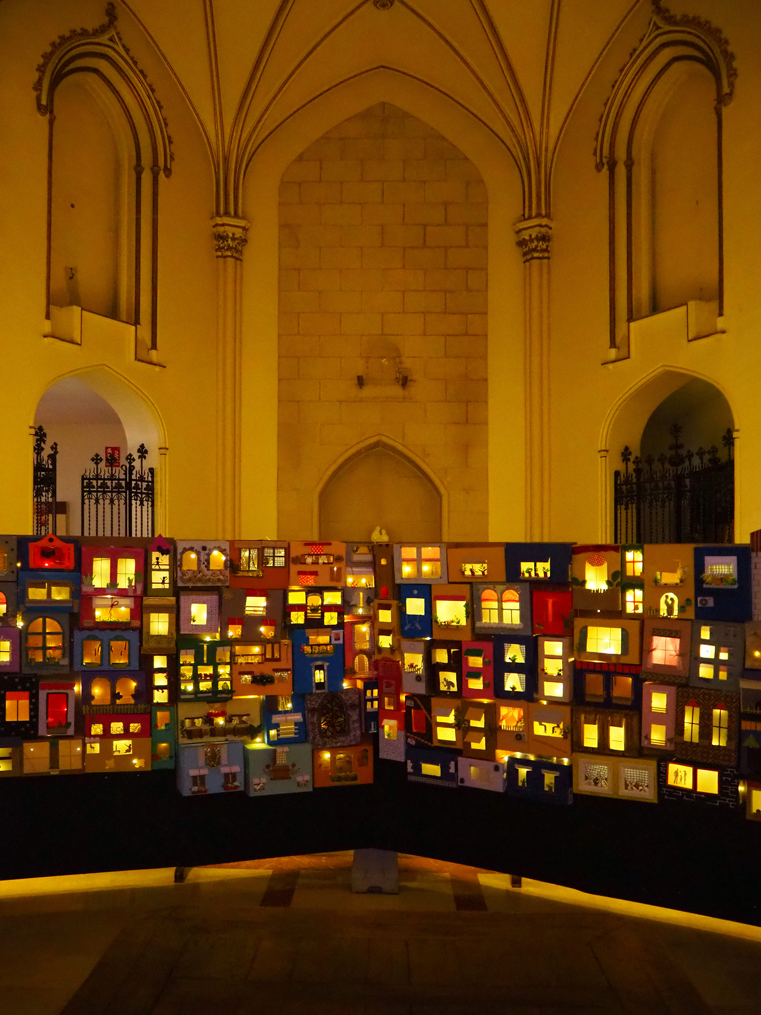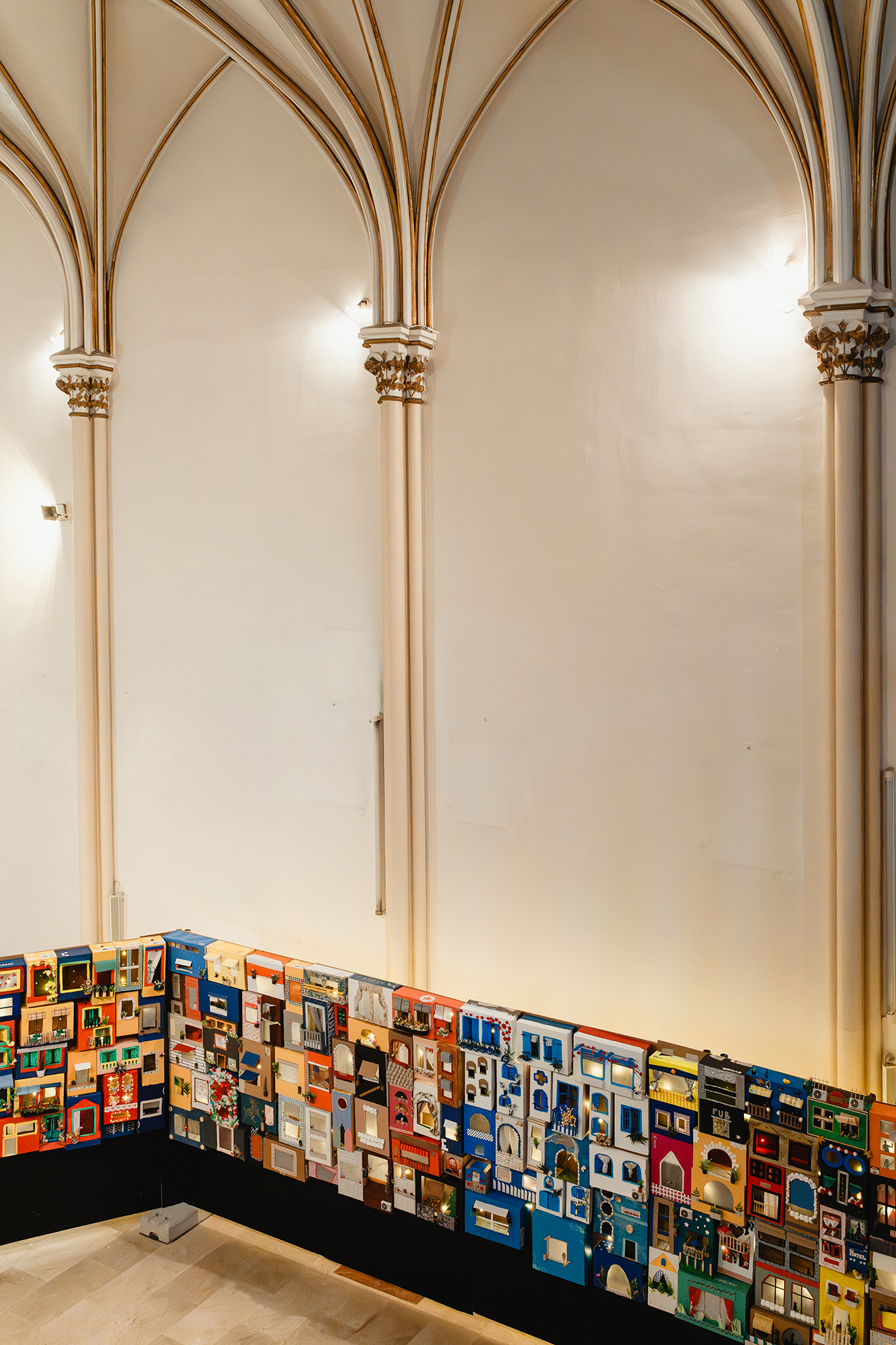 Cuando cae la noche, estas aberturas se convierten en protagonistas, iluminándose como pequeñas escenas que revelan la cotidianidad oculta detrás de los muros.