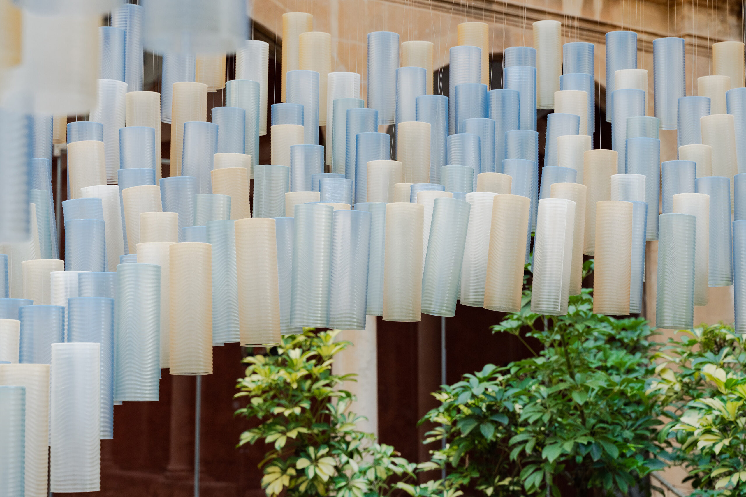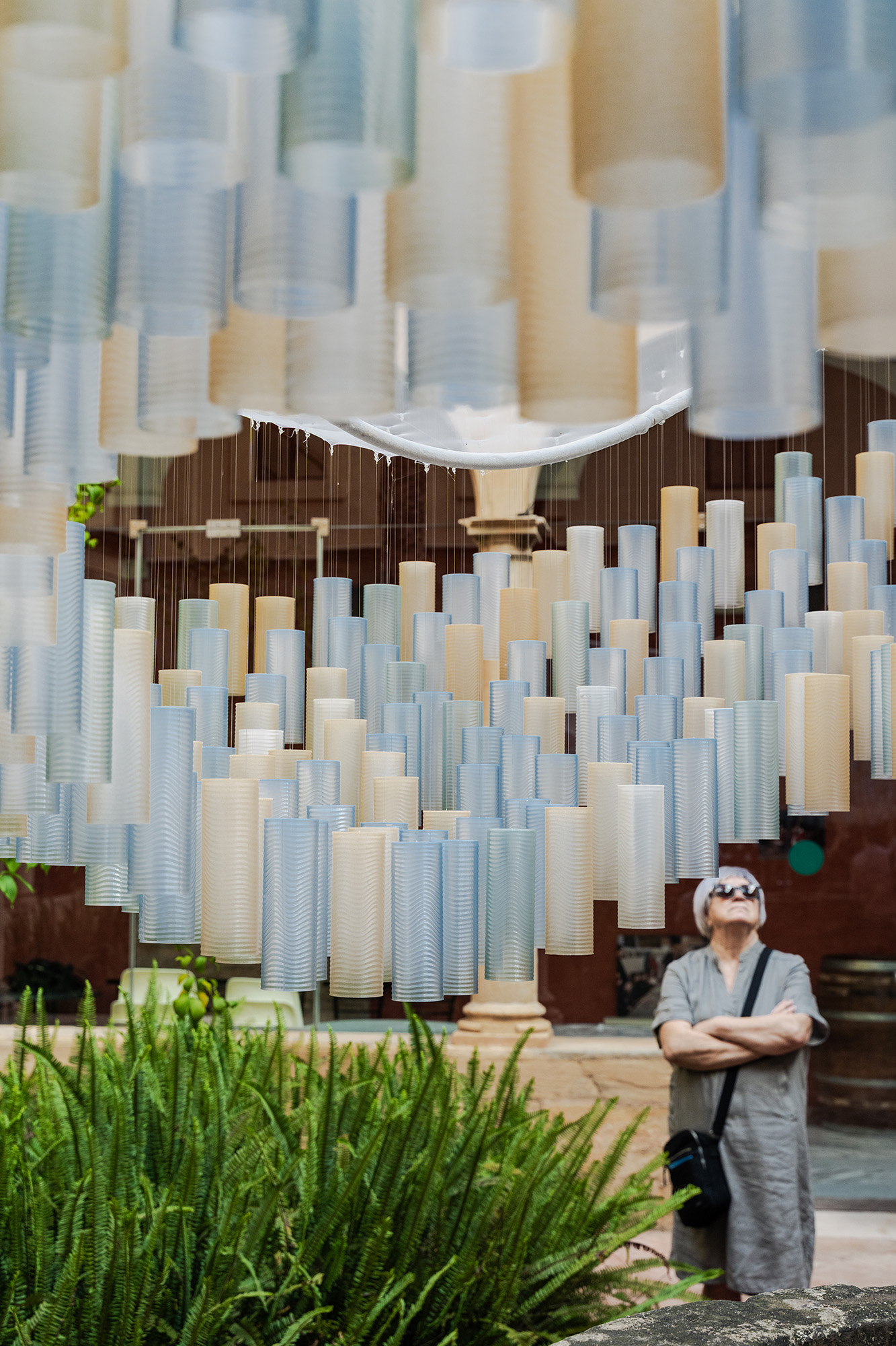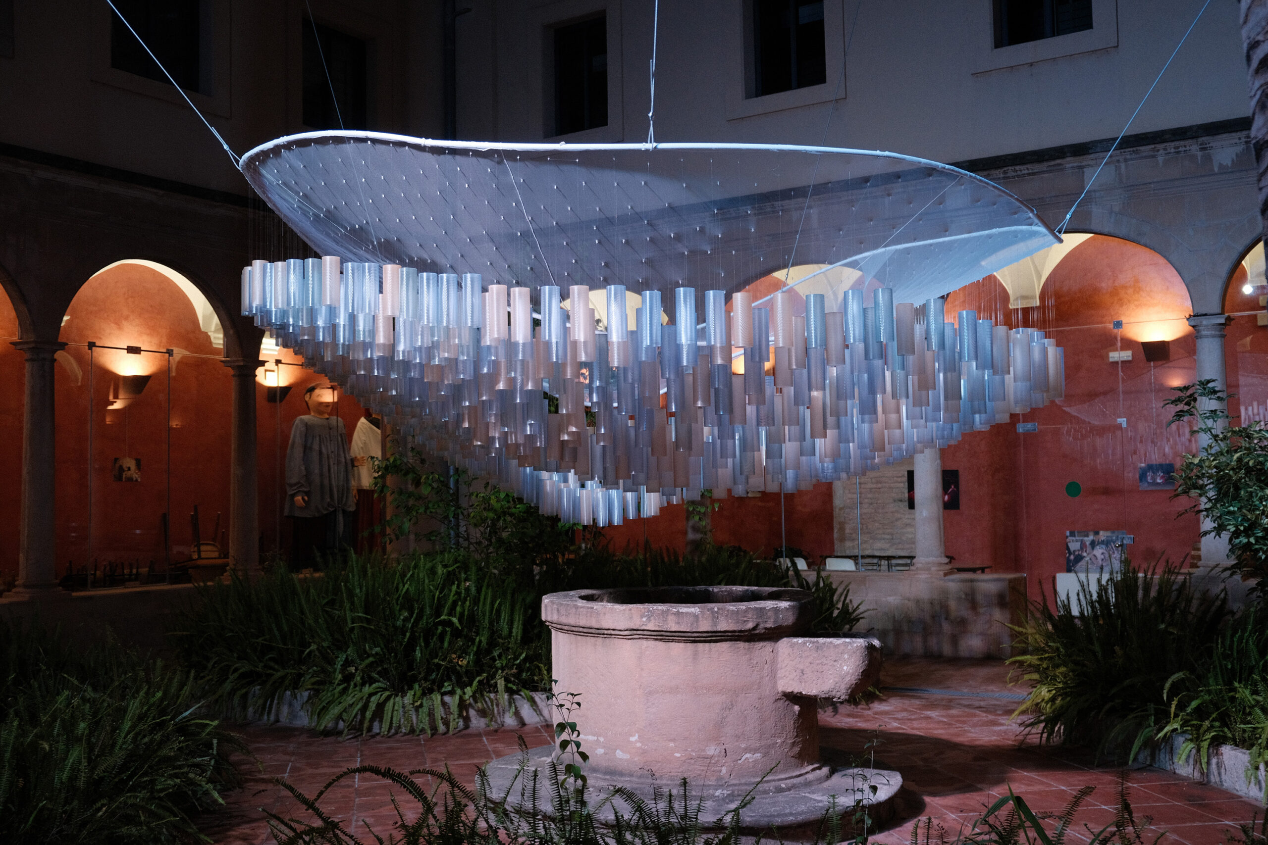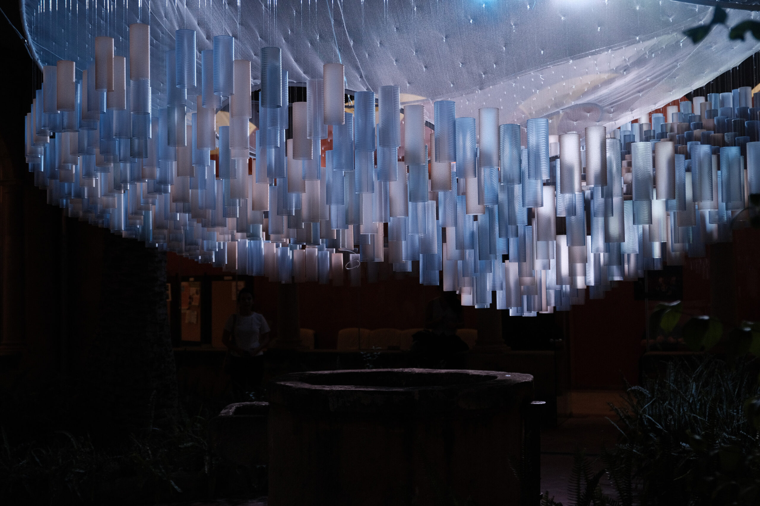 La instalación está elaborada con materiales sostenibles impresos en 3D, desde plásticos reciclados a biopolímeros de origen vegetal. Esta obra refleja el compromiso de los autores con la innovación y el cuidado del medio ambiente.