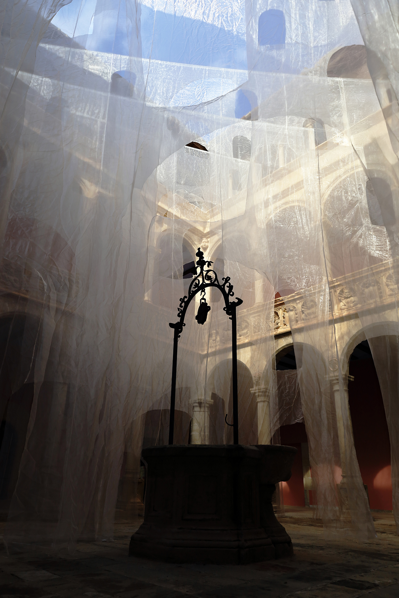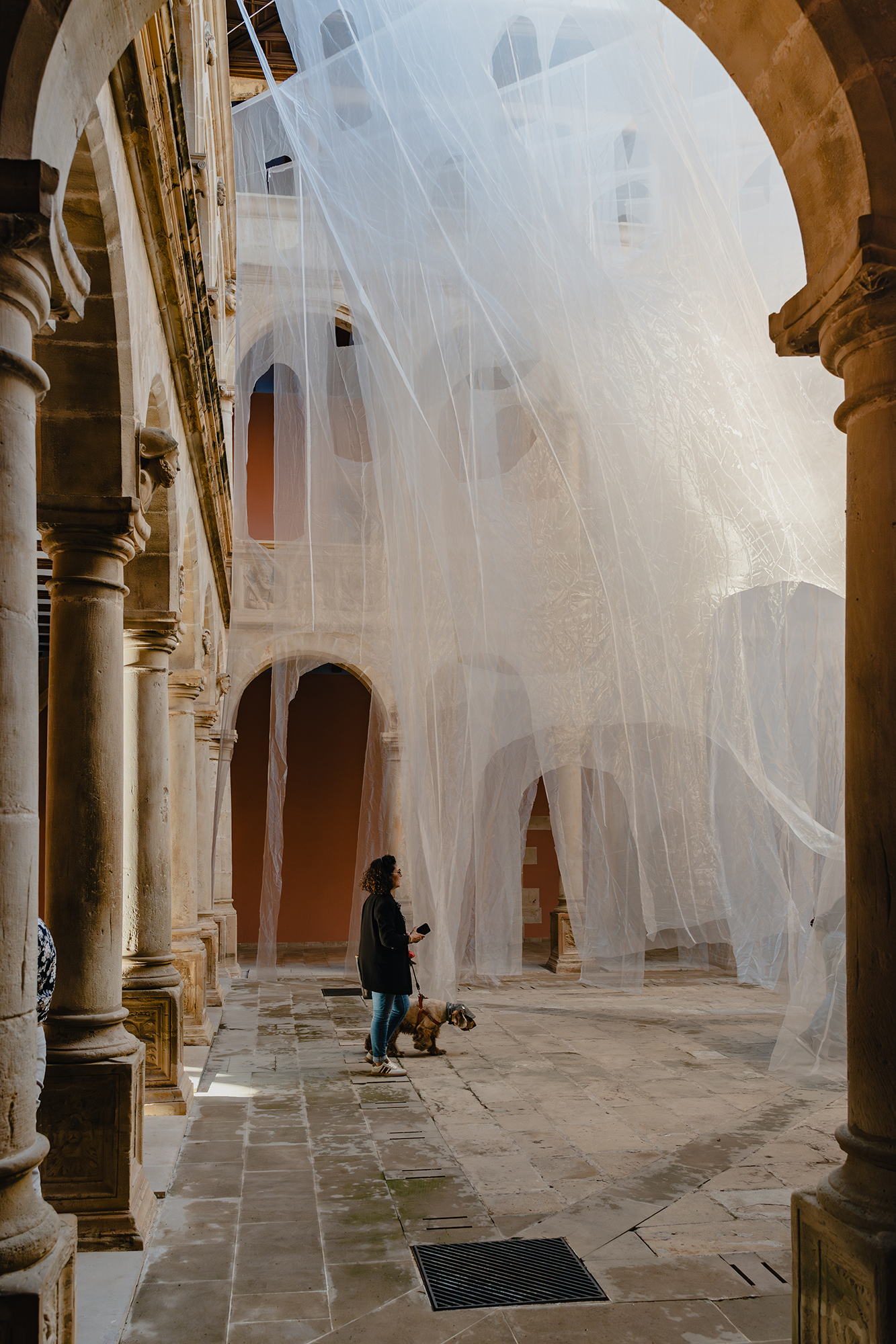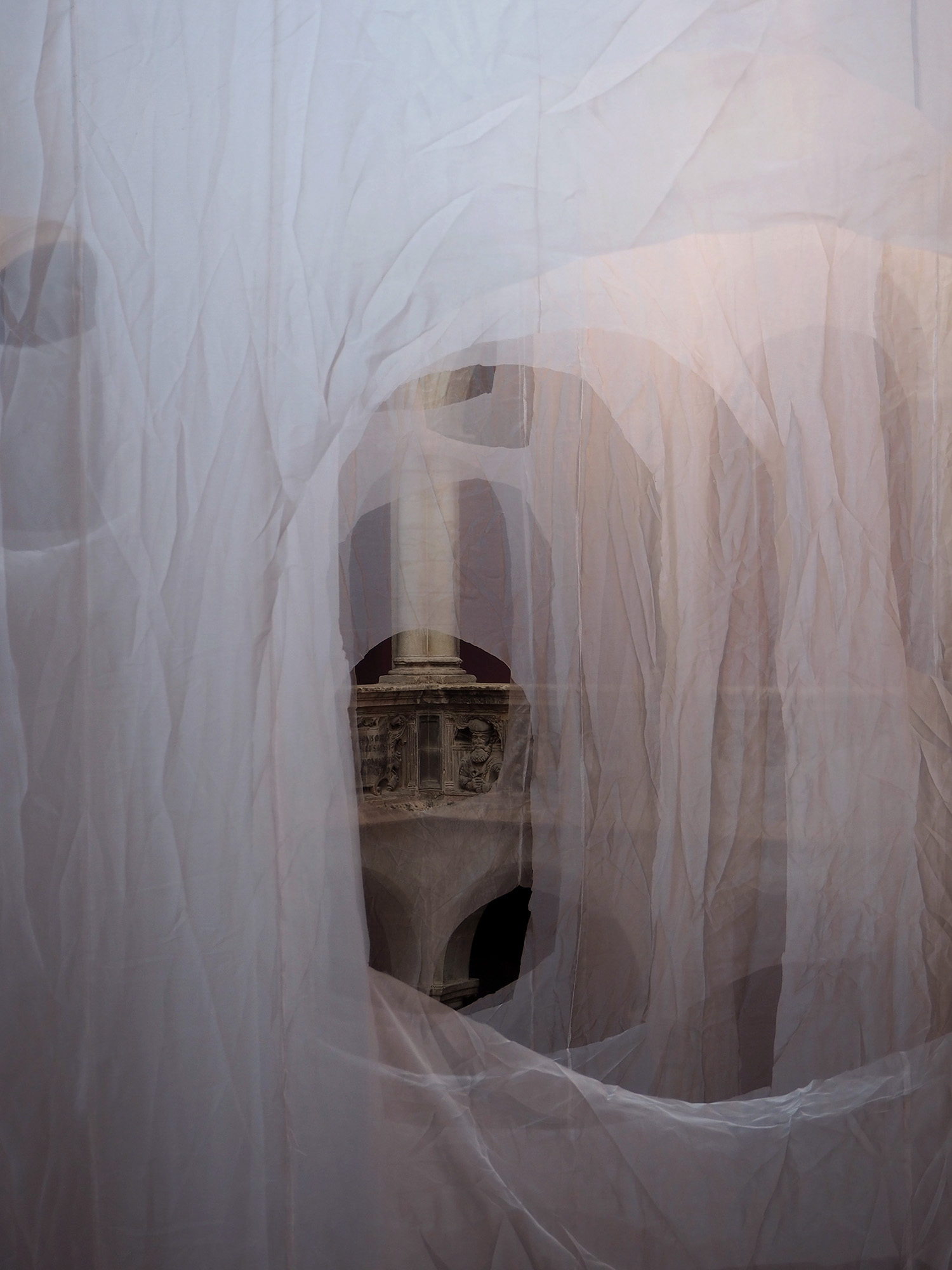 La instalación se compone de velos de organza blanca e iridiscente, recortados en arcos de diferentes dimensiones y situados a distintas escalas: unos monumentales, otros bajos y otros flotando como ventanas. Detrás de un arco, otro: miradas que se cruzan, siluetas que se duplican; lo nítido y lo borroso conviven. Las telas trazan curvas suaves que invitan a una deriva libre, mientras la luz cambiante y el paso del público animan velos y sombras, proyectando reflejos efímeros sobre piedra y columna. Como un sueño, la instalación no impone rutas, solo el deseo de reconocer, conectar y perderse.