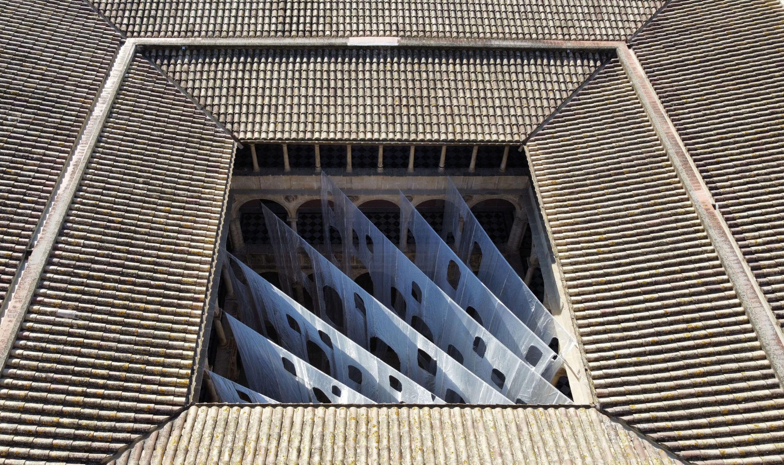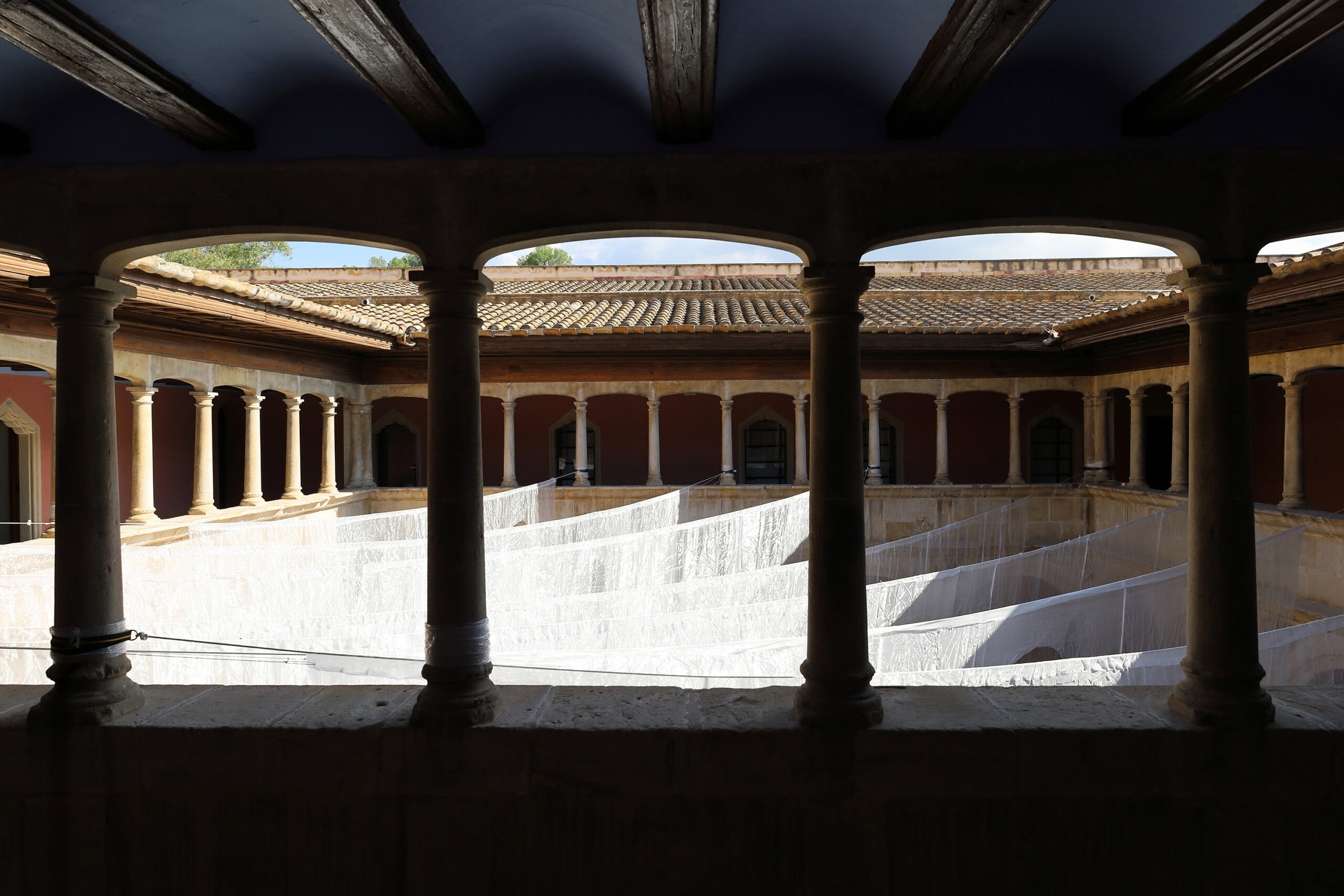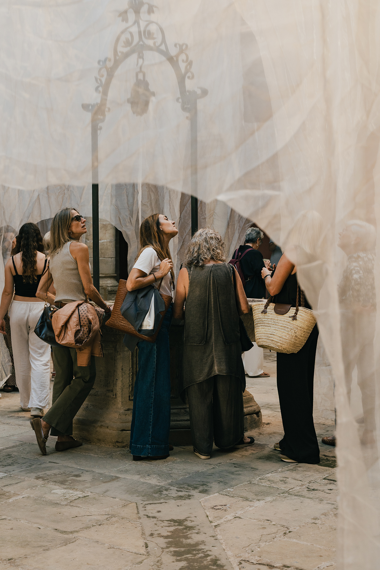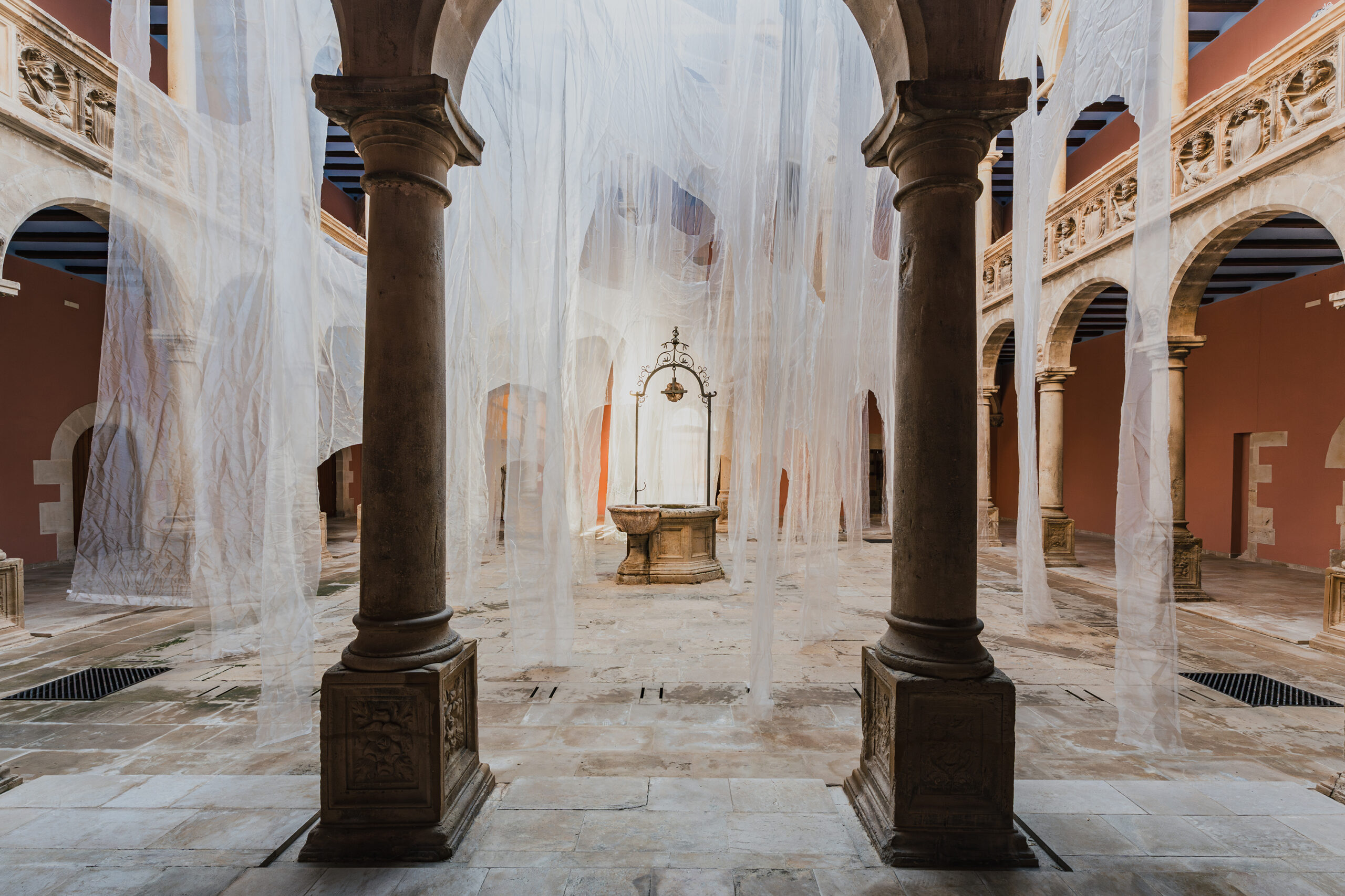 La instalación se compone de velos de organza blanca e iridiscente, recortados en arcos de diferentes dimensiones y situados a distintas escalas: unos monumentales, otros bajos y otros flotando como ventanas. Detrás de un arco, otro: miradas que se cruzan, siluetas que se duplican; lo nítido y lo borroso conviven. Las telas trazan curvas suaves que invitan a una deriva libre, mientras la luz cambiante y el paso del público animan velos y sombras, proyectando reflejos efímeros sobre piedra y columna. Como un sueño, la instalación no impone rutas, solo el deseo de reconocer, conectar y perderse.