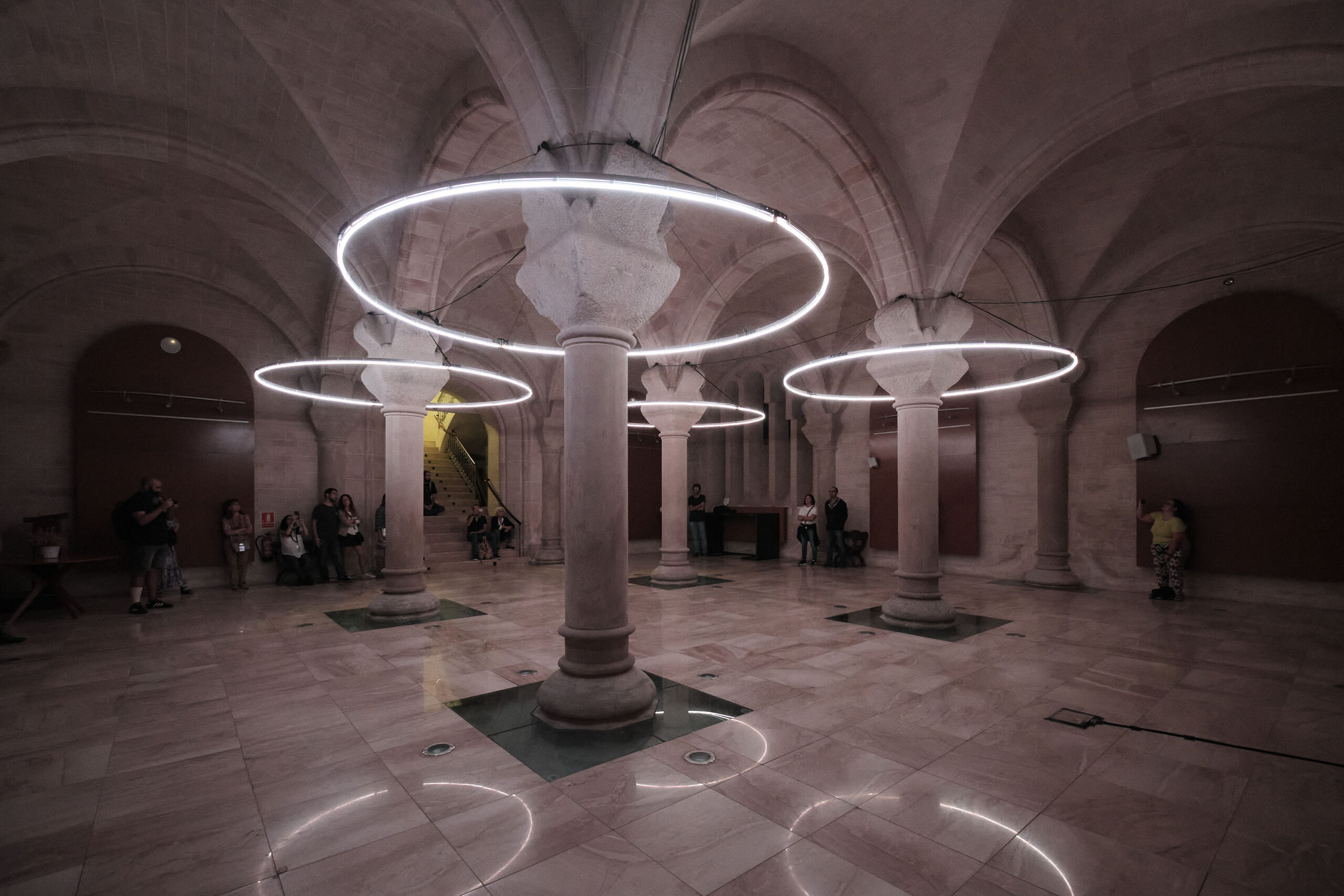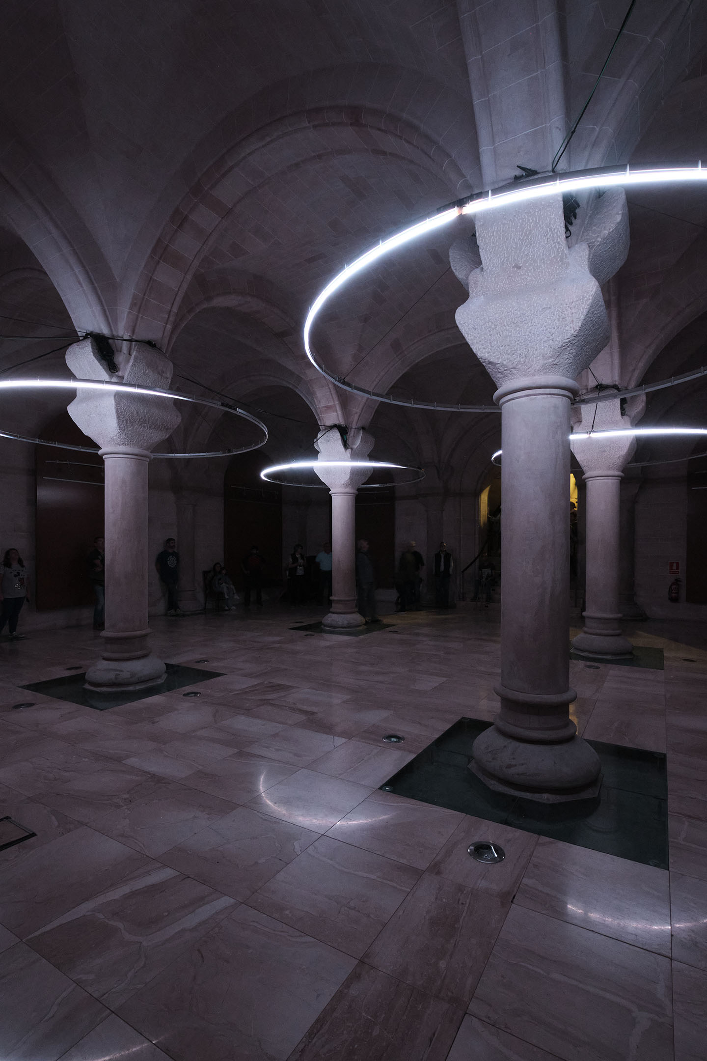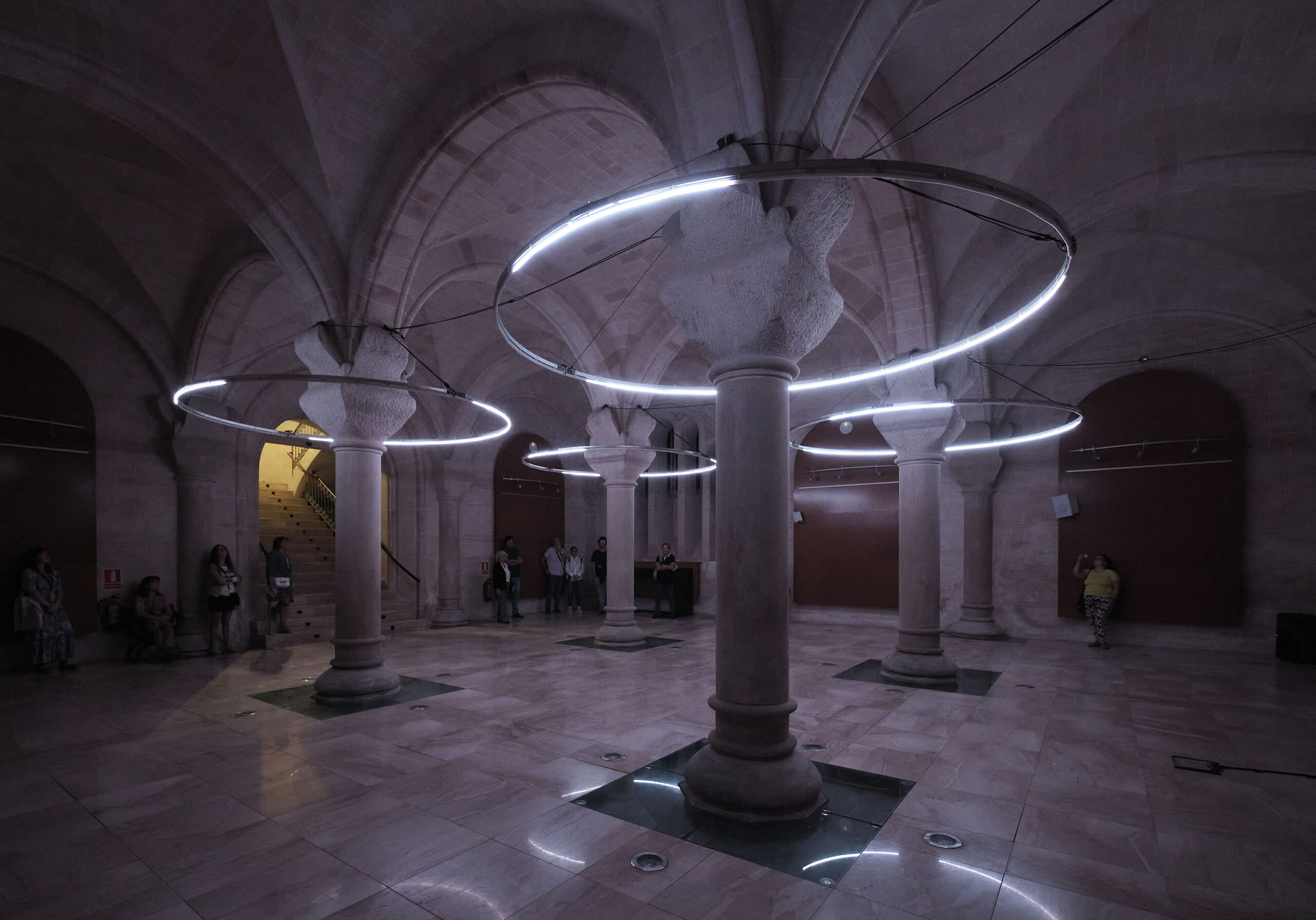 Aura son anillos de luz que rodean las columnas, que iluminan el entorno y que generan sombras cambiantes que evolucionan lentamente con el paso del tiempo. Anillos de luz que aprisionan los pilares que sustentan el edificio y le dan la ligereza de la luz y la sombra.