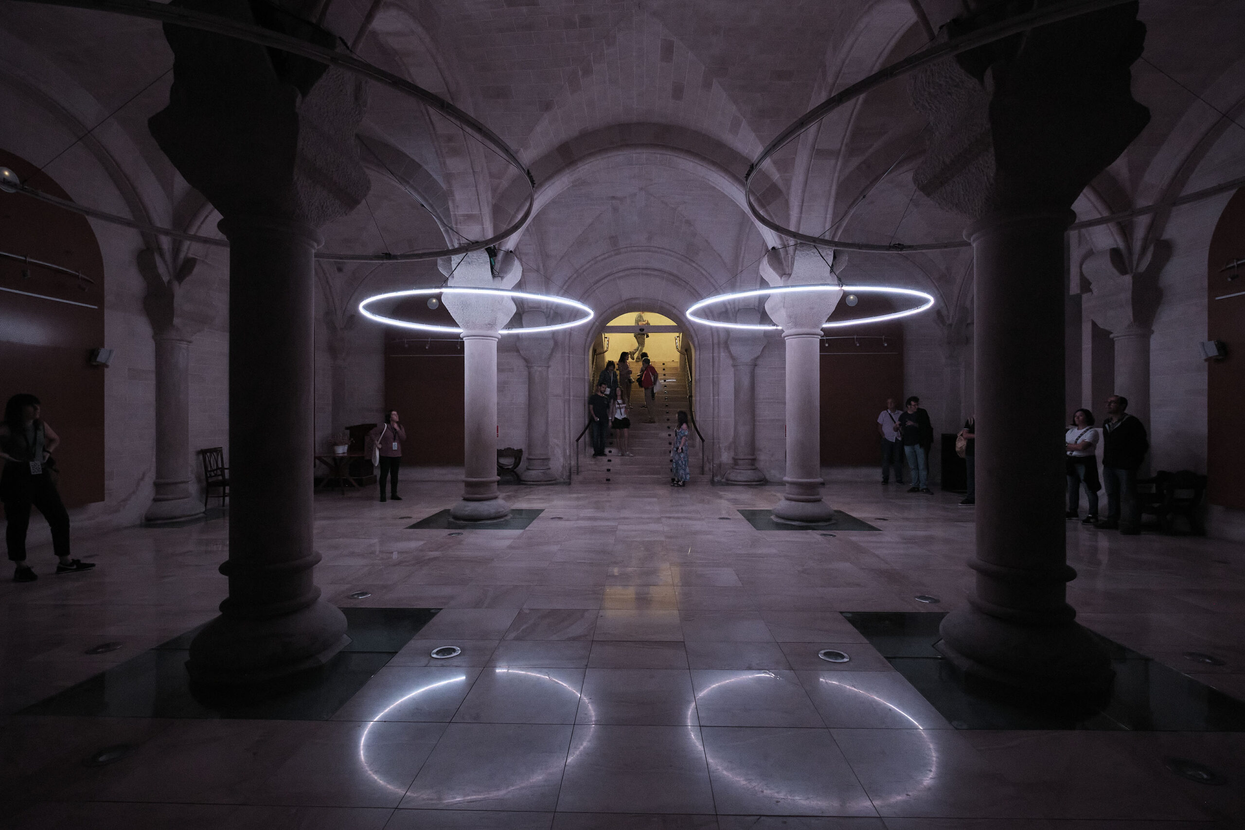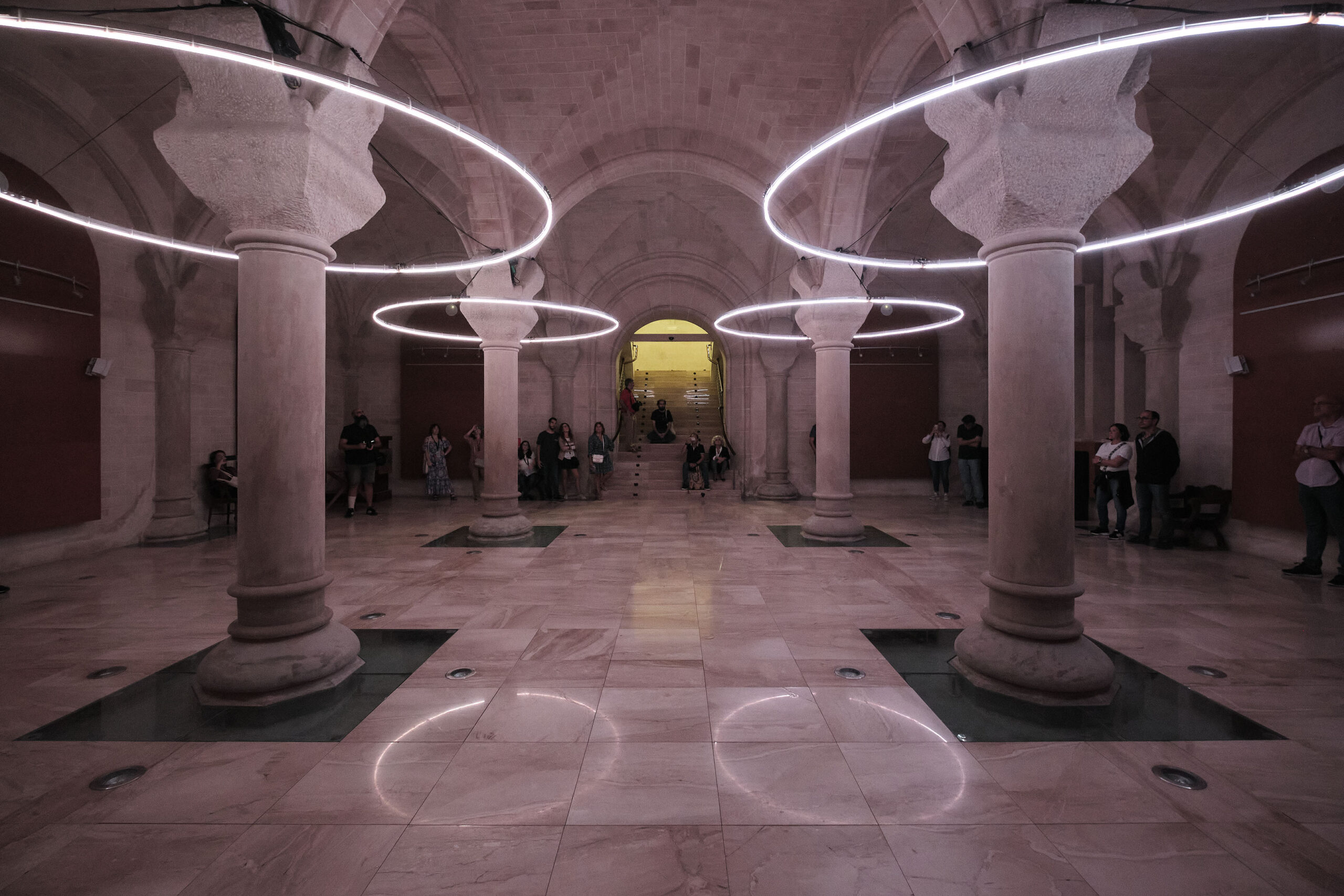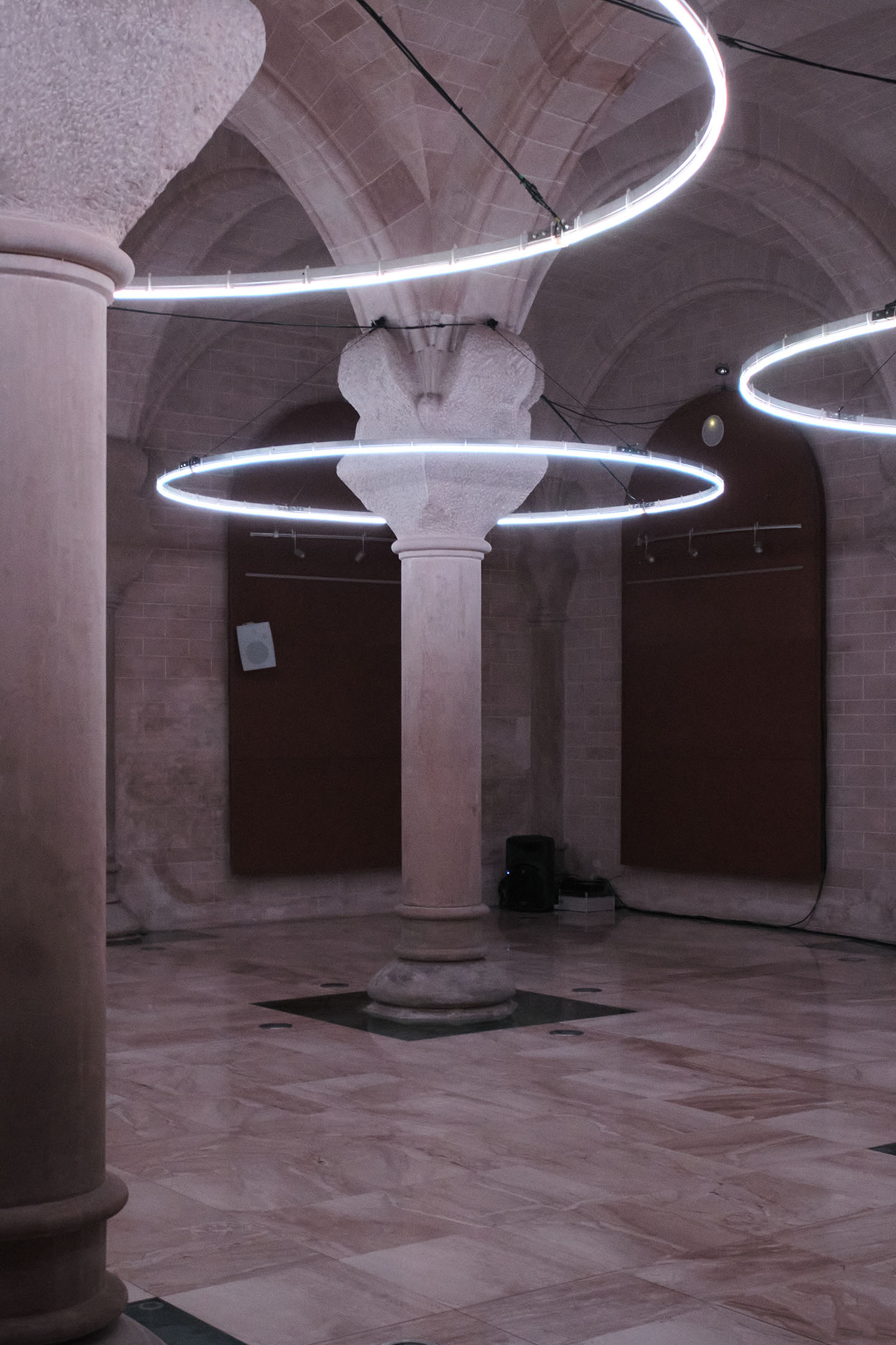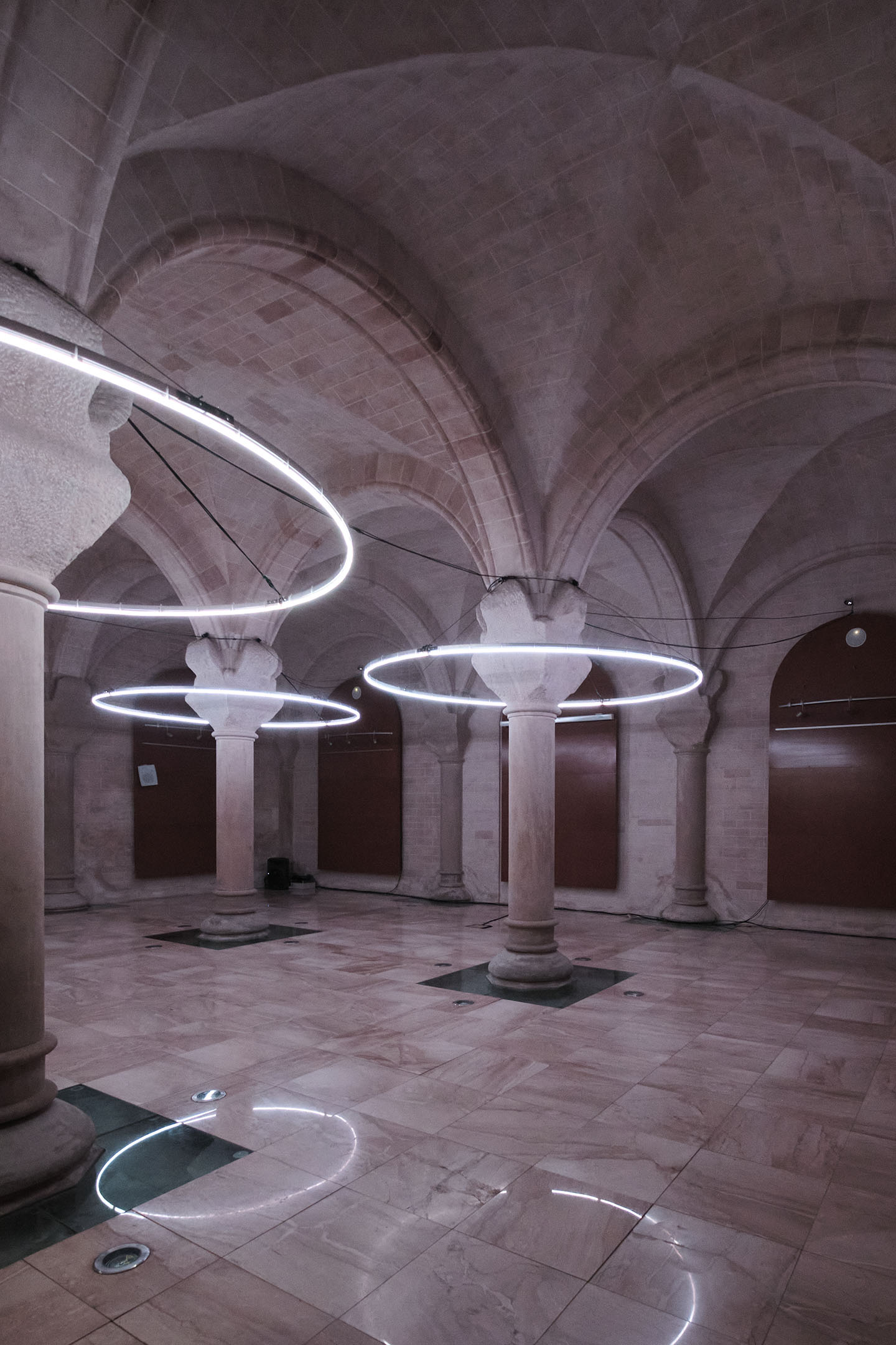 Aura son anillos de luz que rodean las columnas, que iluminan el entorno y que generan sombras cambiantes que evolucionan lentamente con el paso del tiempo. Anillos de luz que aprisionan los pilares que sustentan el edificio y le dan la ligereza de la luz y la sombra.